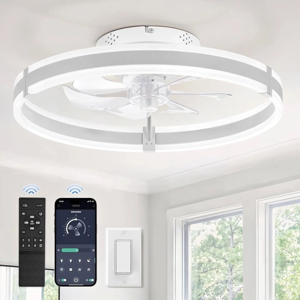 Compact flush-mount ceiling fan with a bright 32W LED light (up to 3840 lumens), offering stepless dimming and adjustable color temperature from 3000K to 6000K. The quiet DC motor with 7 blades delivers strong airflow with 6 speeds, reversible direction, and a natural breeze mode. Control lighting and fan settings separately using the remote or app, with timer options for added convenience. Lightweight, easy to install, and ideal for bedrooms or small spaces.