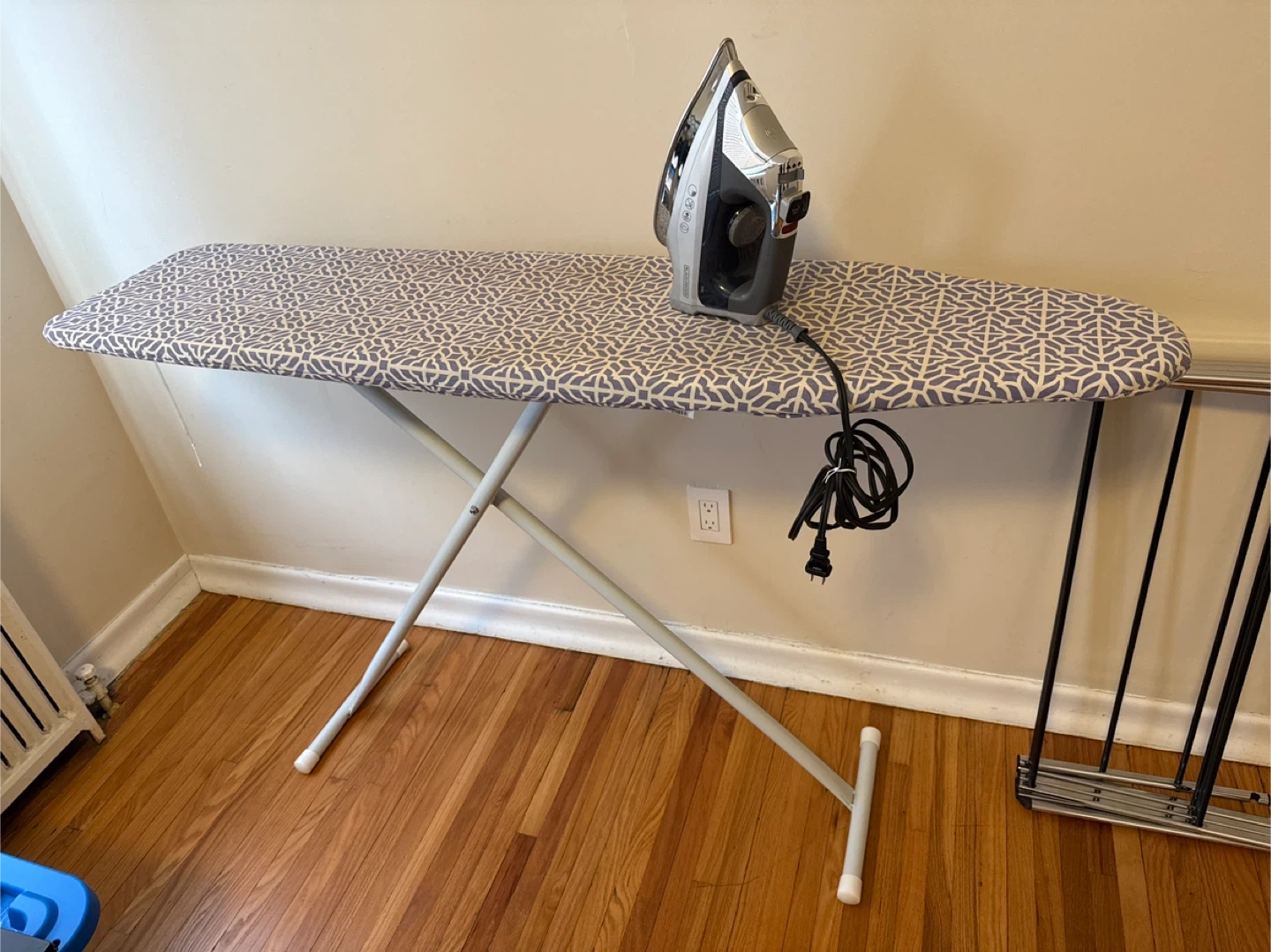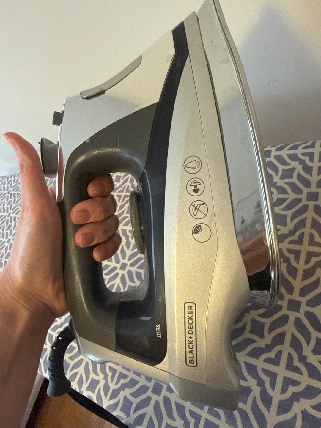 This is a Black+Decker iron and a patterned ironing board. The iron has a steam function. It's great for keeping your clothes wrinkle-free. The ironing board is a standard size for home use.