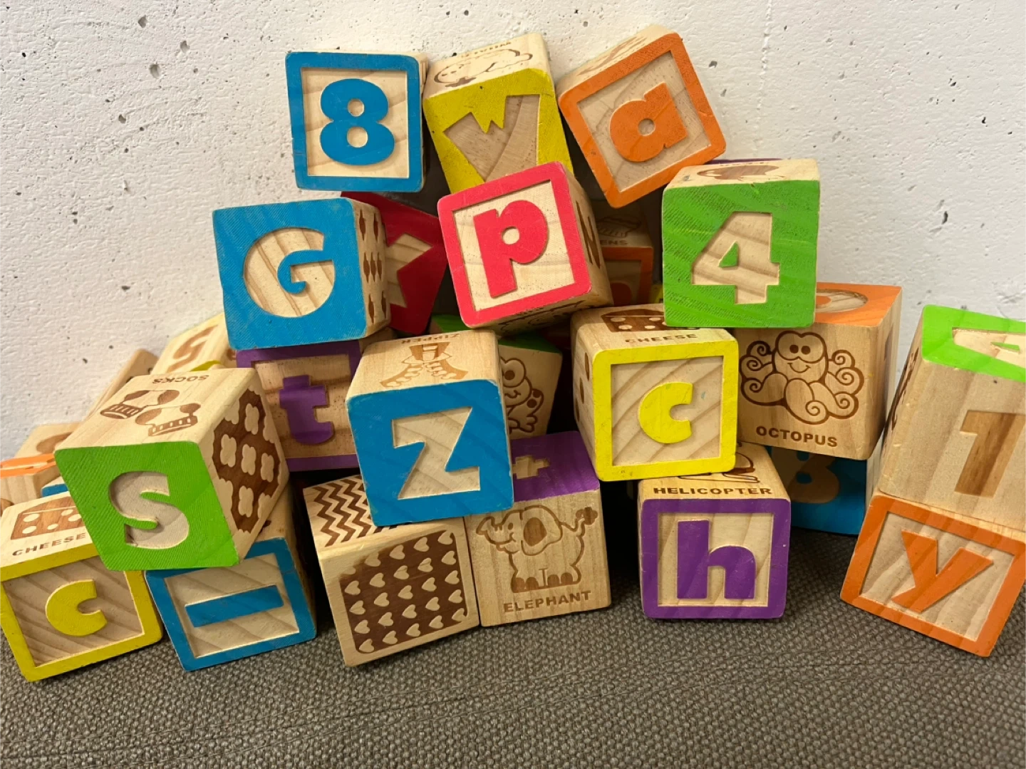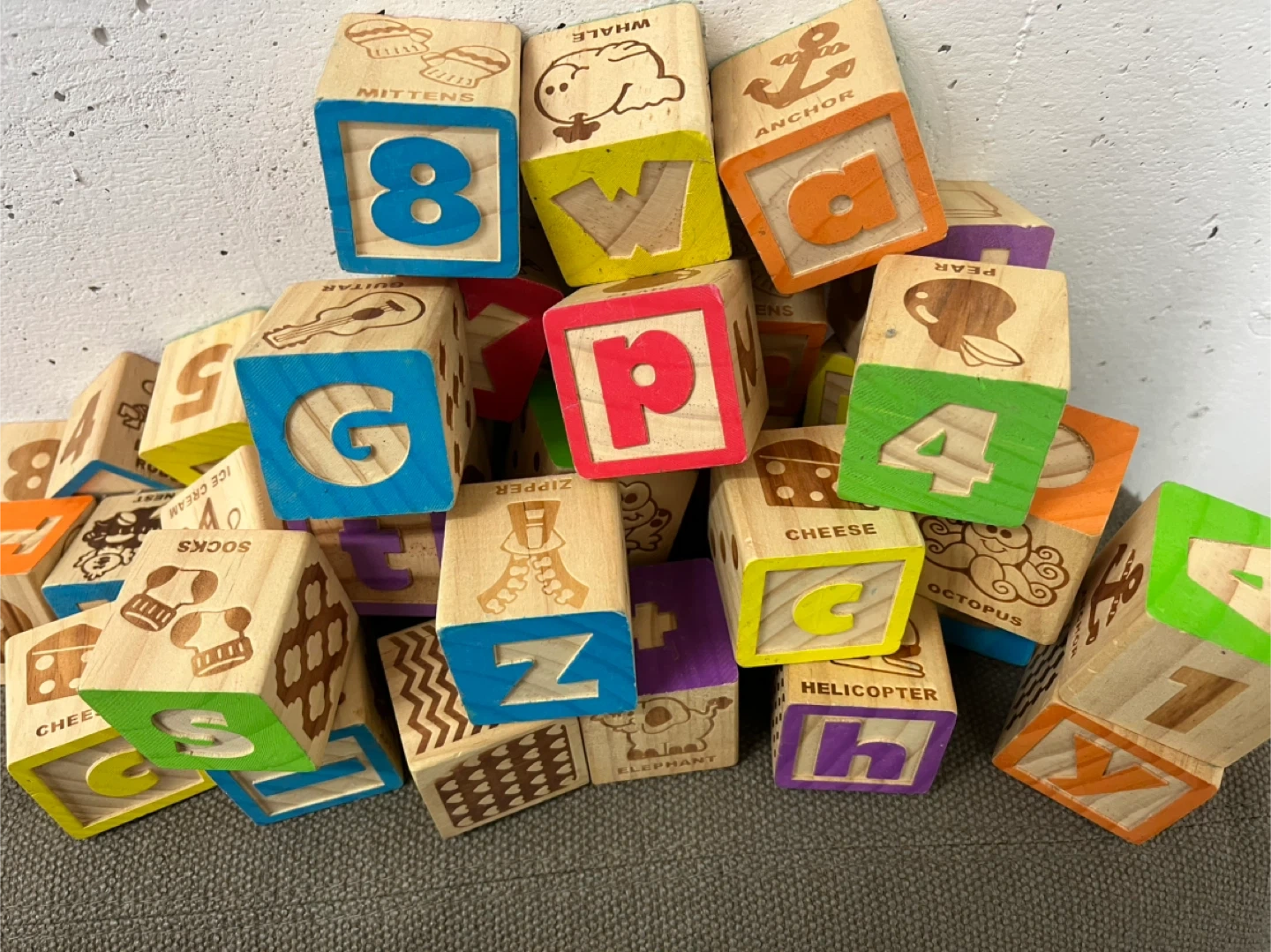 Set of wooden alphabet and number blocks. Each block has letters, numbers, or pictures with corresponding words. Blocks are made of wood and feature colourful painted details.