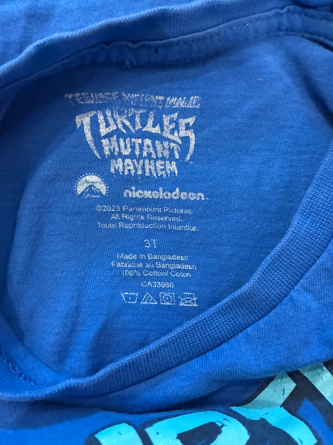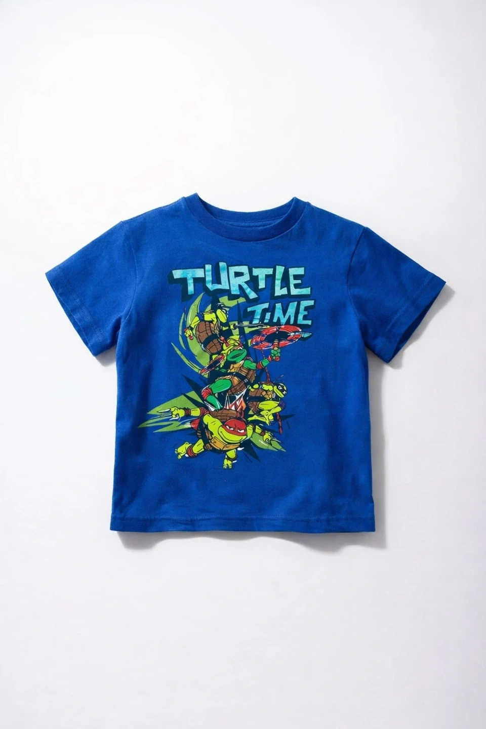 A bright blue t-shirt featuring the Teenage Mutant Ninja Turtles with 'Turtle Time' graphic. Made from 100% cotton. Size 3T.
