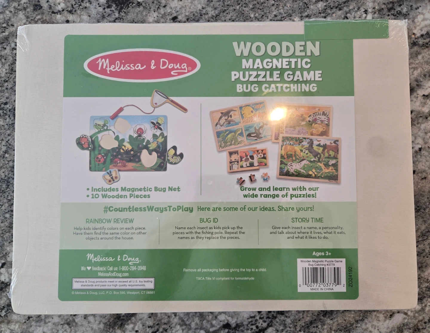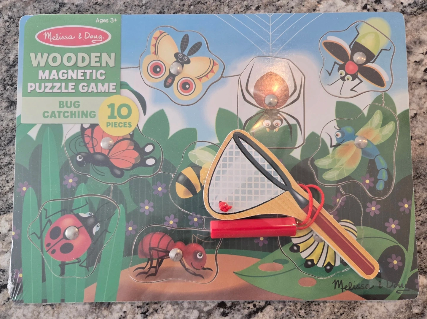 Brand new in package, Melissa & Doug wooden magnetic puzzle game is designed for bug catching fun!