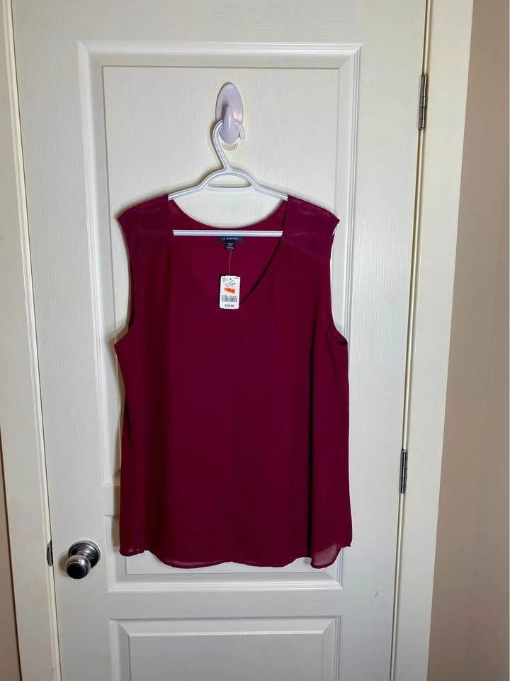 New with tags, Le Chateau, double-lined, sleeveless, v-neck, lace shoulder top. XXL. Paid $30+tax on sale.