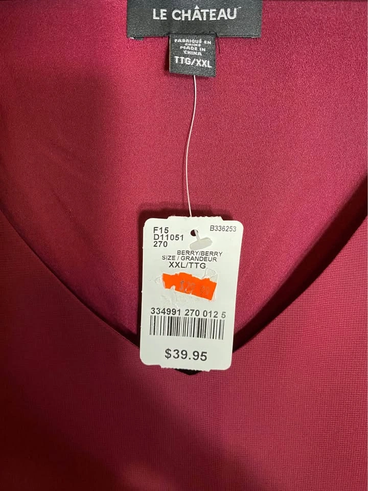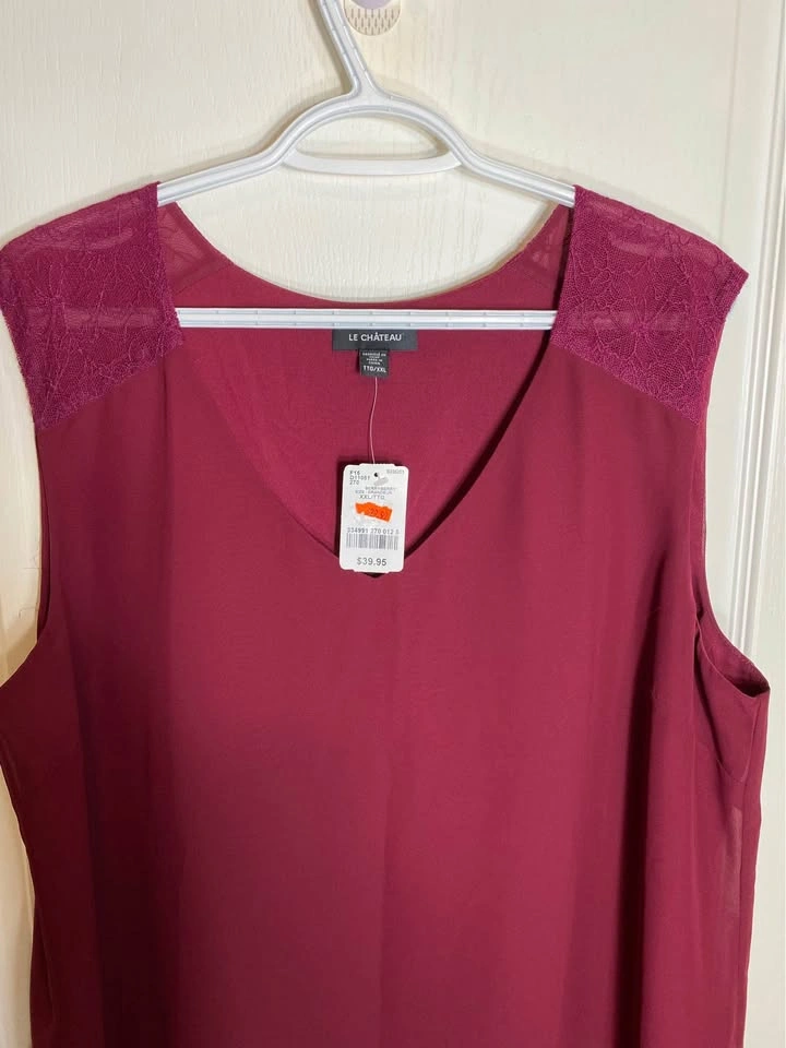 New with tags, Le Chateau, double-lined, sleeveless, v-neck, lace shoulder top. XXL. Paid $30+tax on sale.
