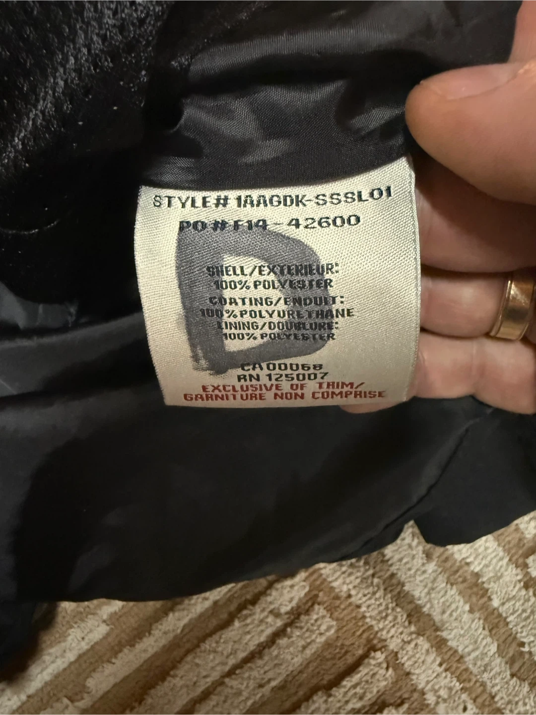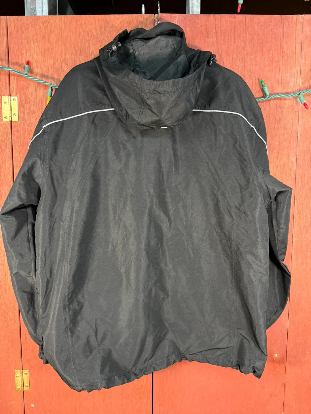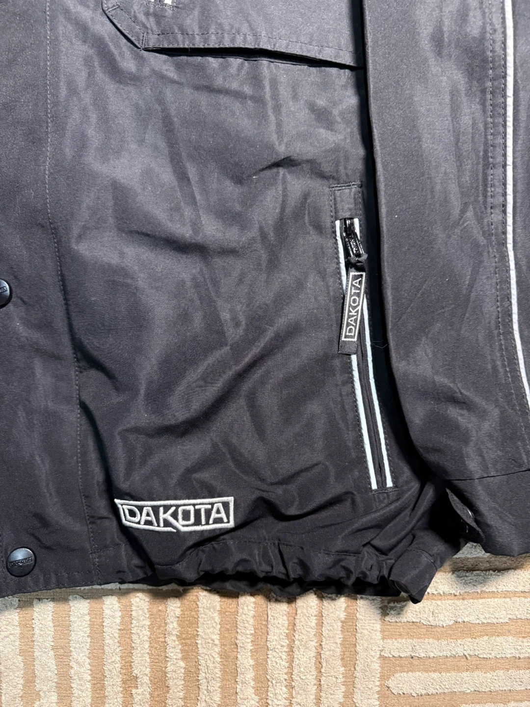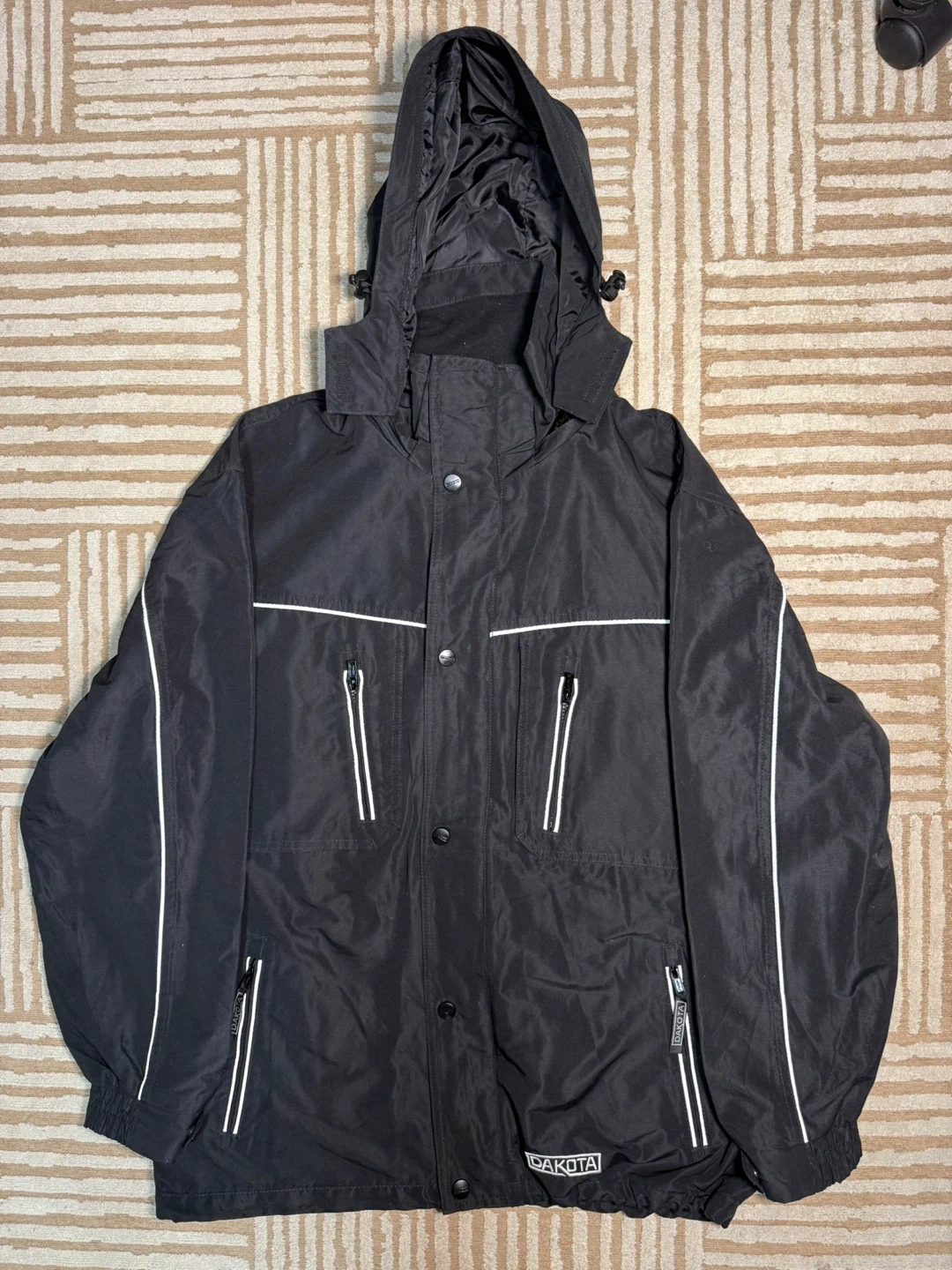 Dakota black hooded jacket with white piping details. It's a size M/M and made of 100% polyester shell with a polyurethane coating. Multiple zippered pockets are included.