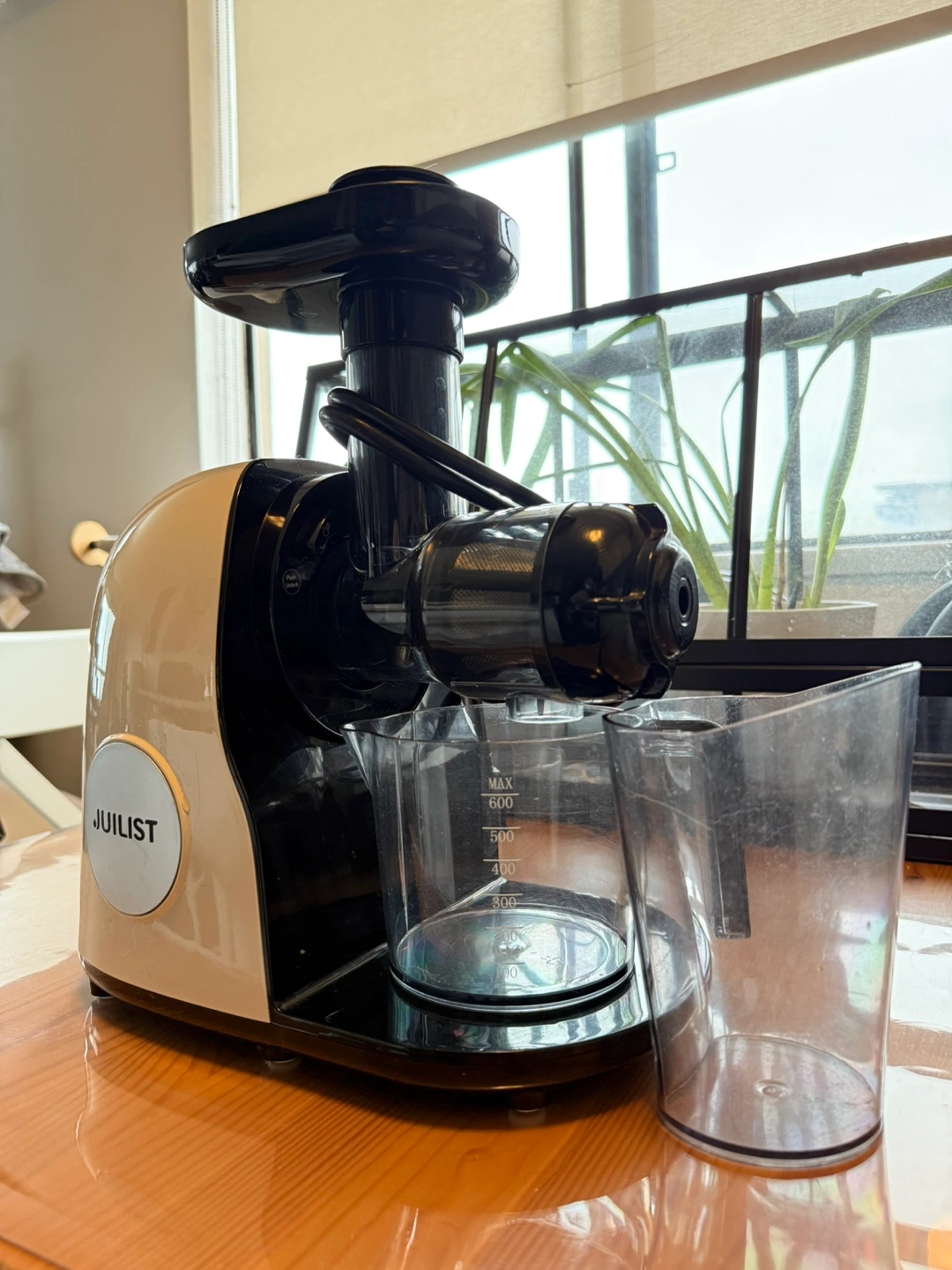 🧃Slow masticating juicer. Cream coloured body with black accents. Includes two clear plastic containers. Excellent for making fresh juices.