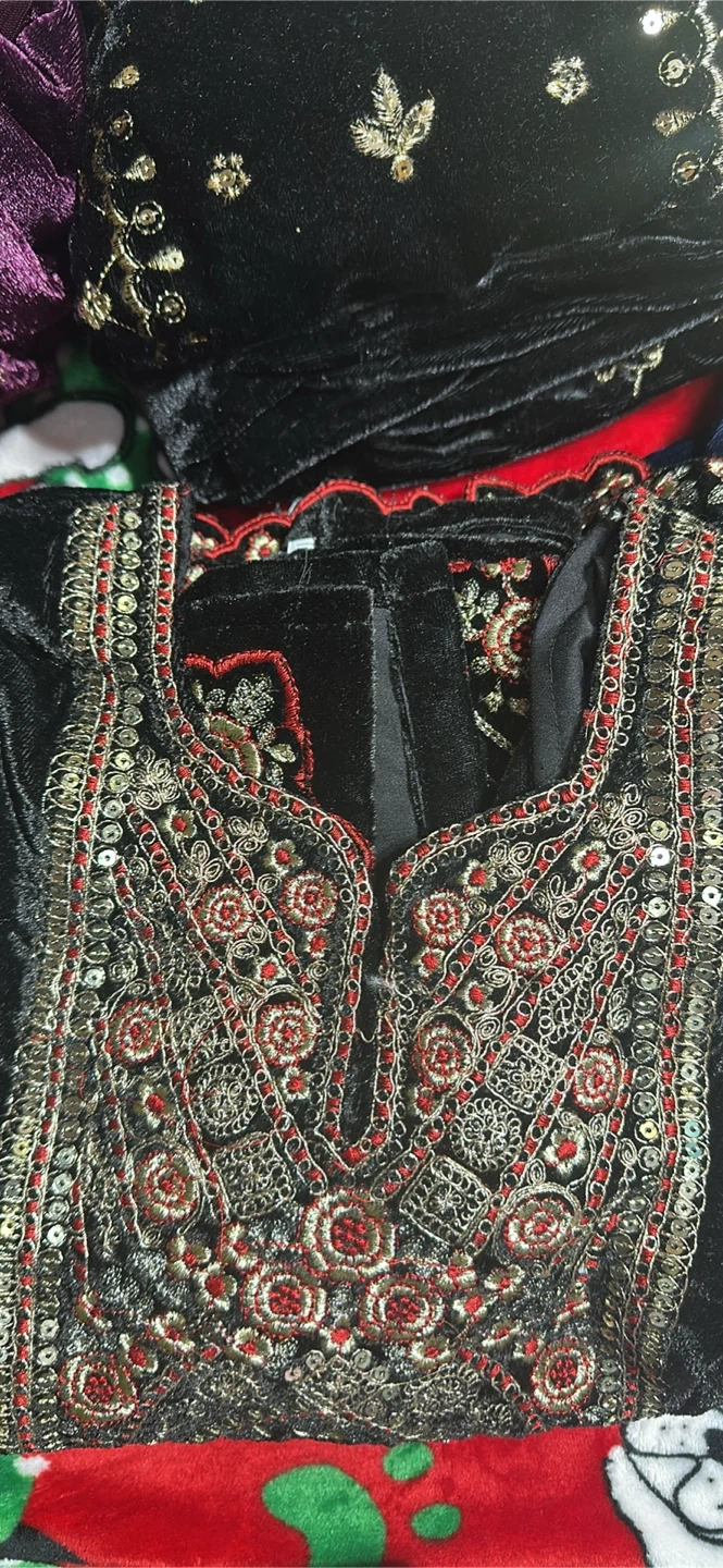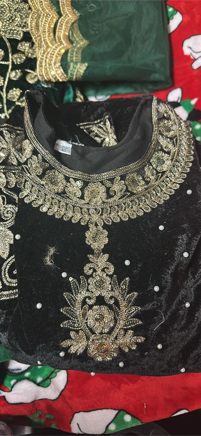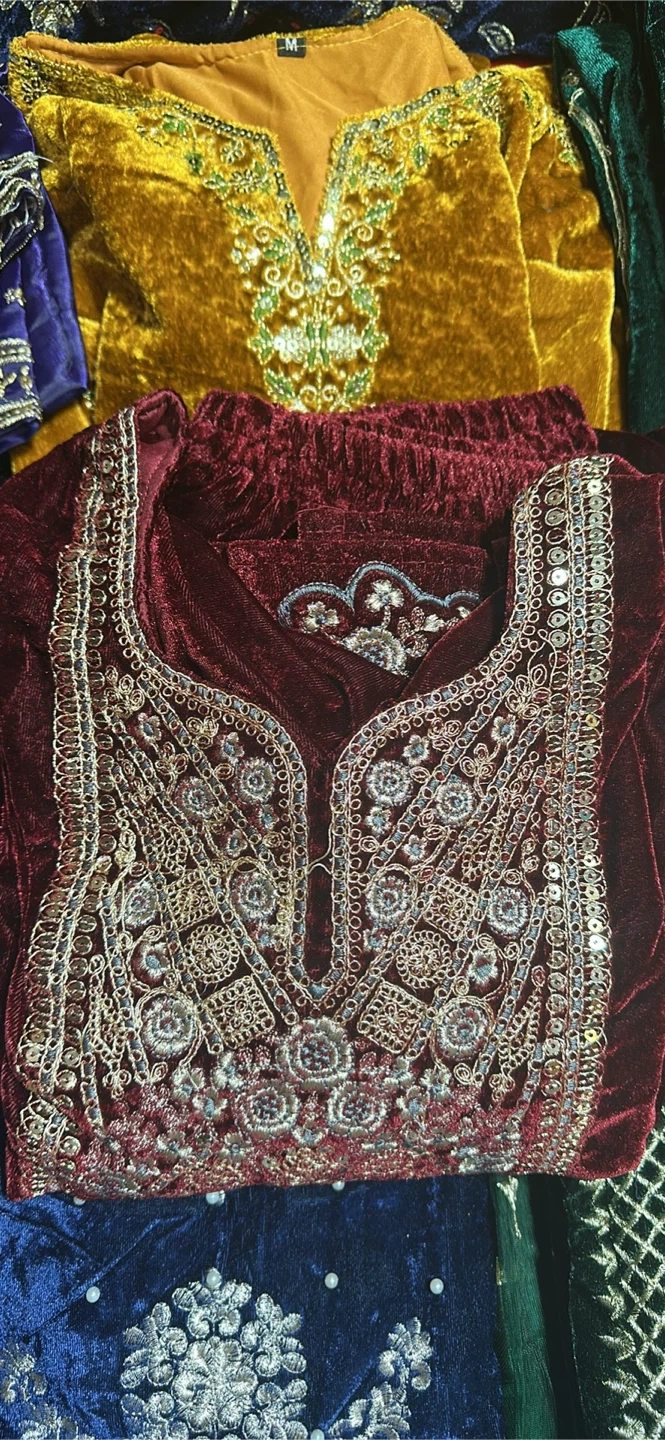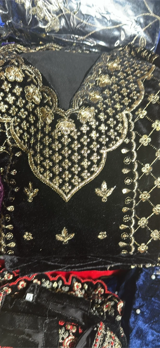This navy velvet kurti set features intricate gold embroidery and sequin detailing. It includes matching pants and a dupatta. Velvet material with detailed embellishments.