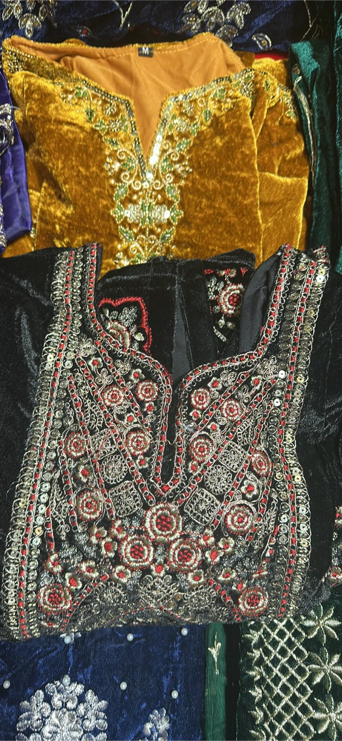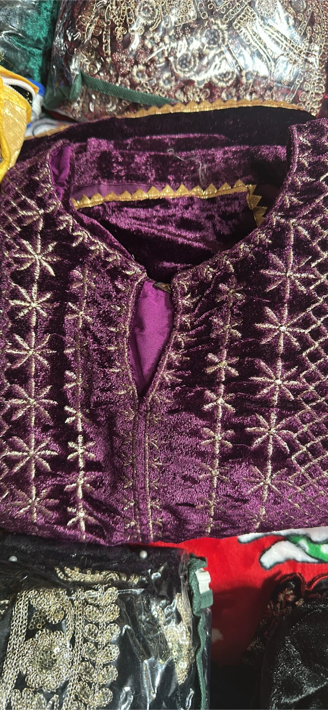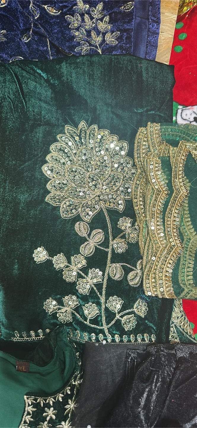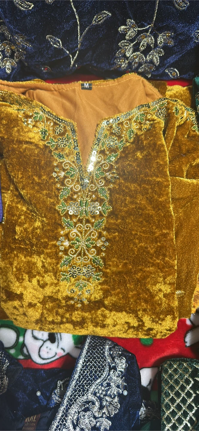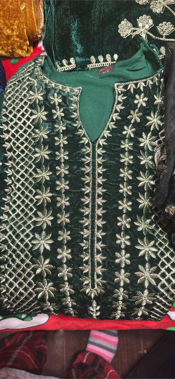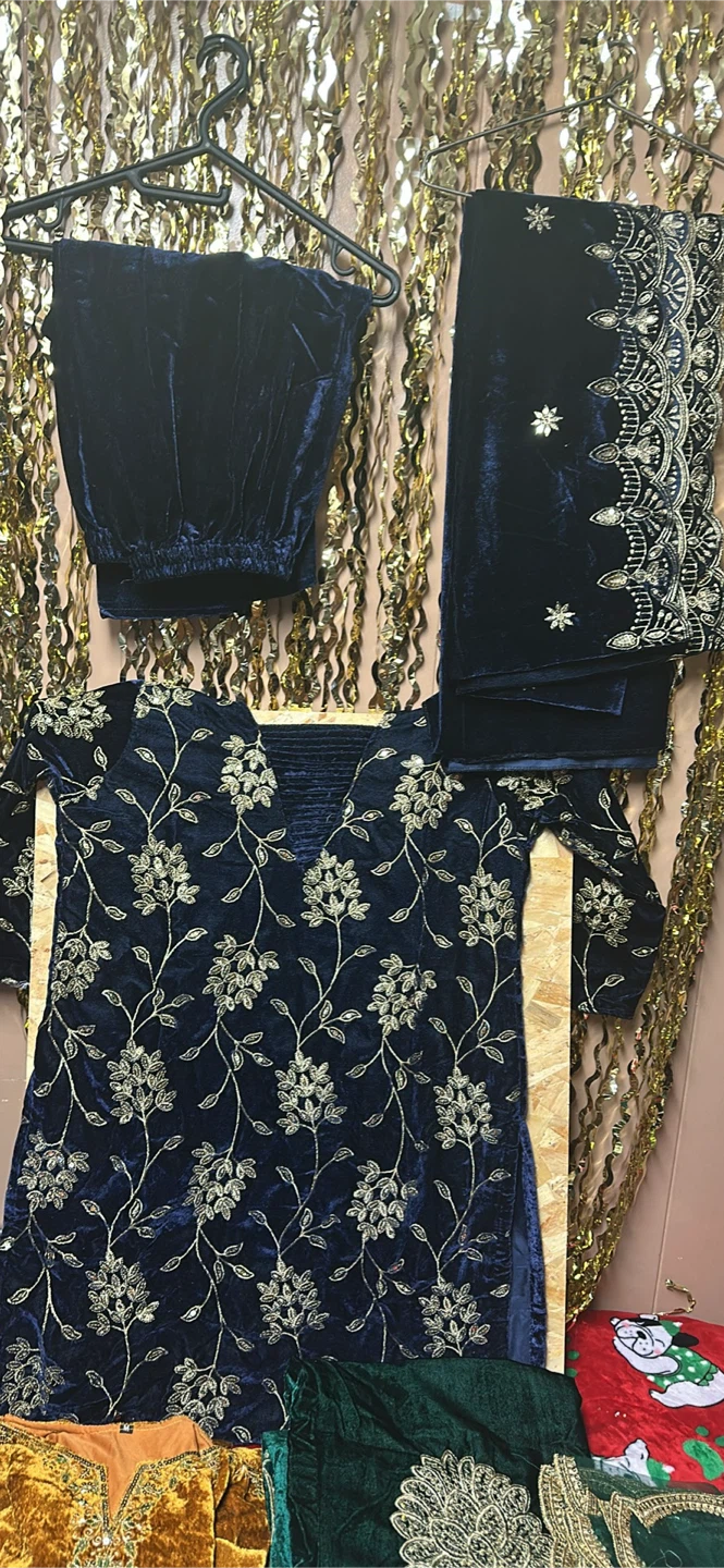 This navy velvet kurti set features intricate gold embroidery and sequin detailing. It includes matching pants and a dupatta. Velvet material with detailed embellishments.