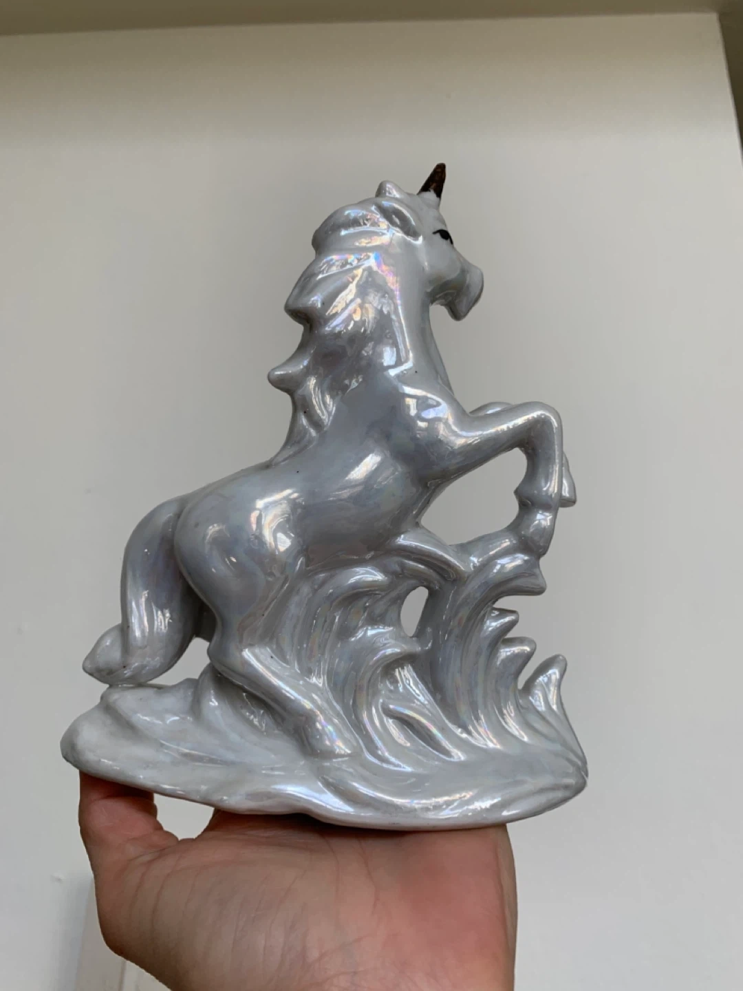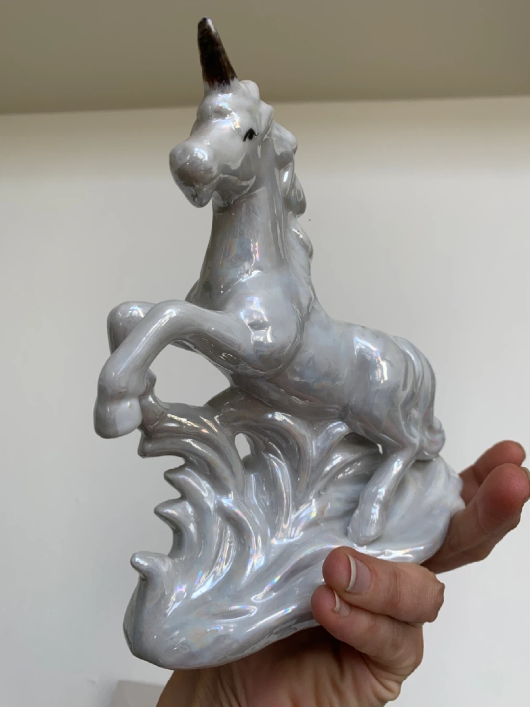 This is a pearlescent ceramic unicorn figurine, appearing to be in a rearing pose. It's a decorative piece with a glossy, iridescent finish that catches the light. The figurine is made of ceramic material.