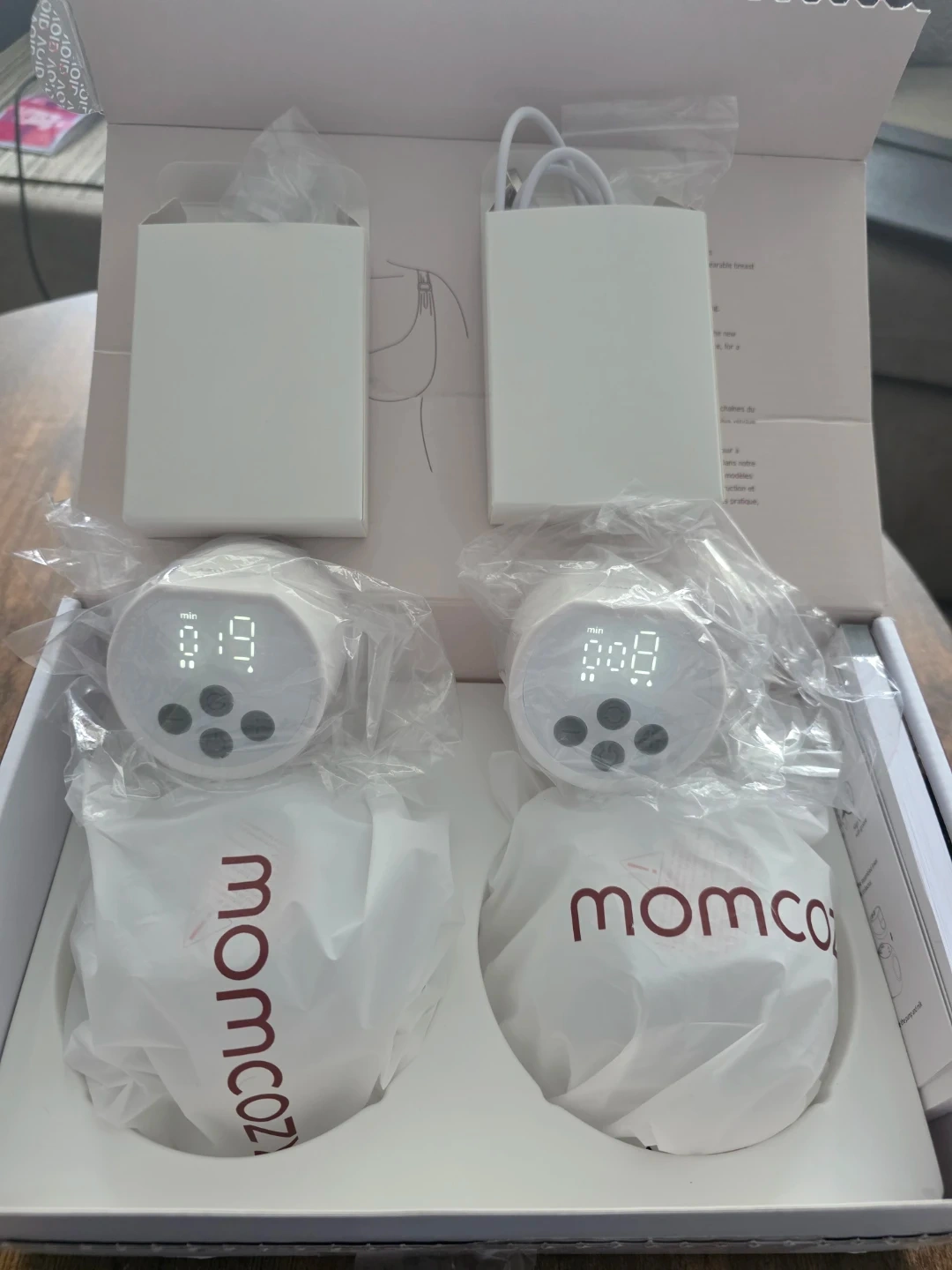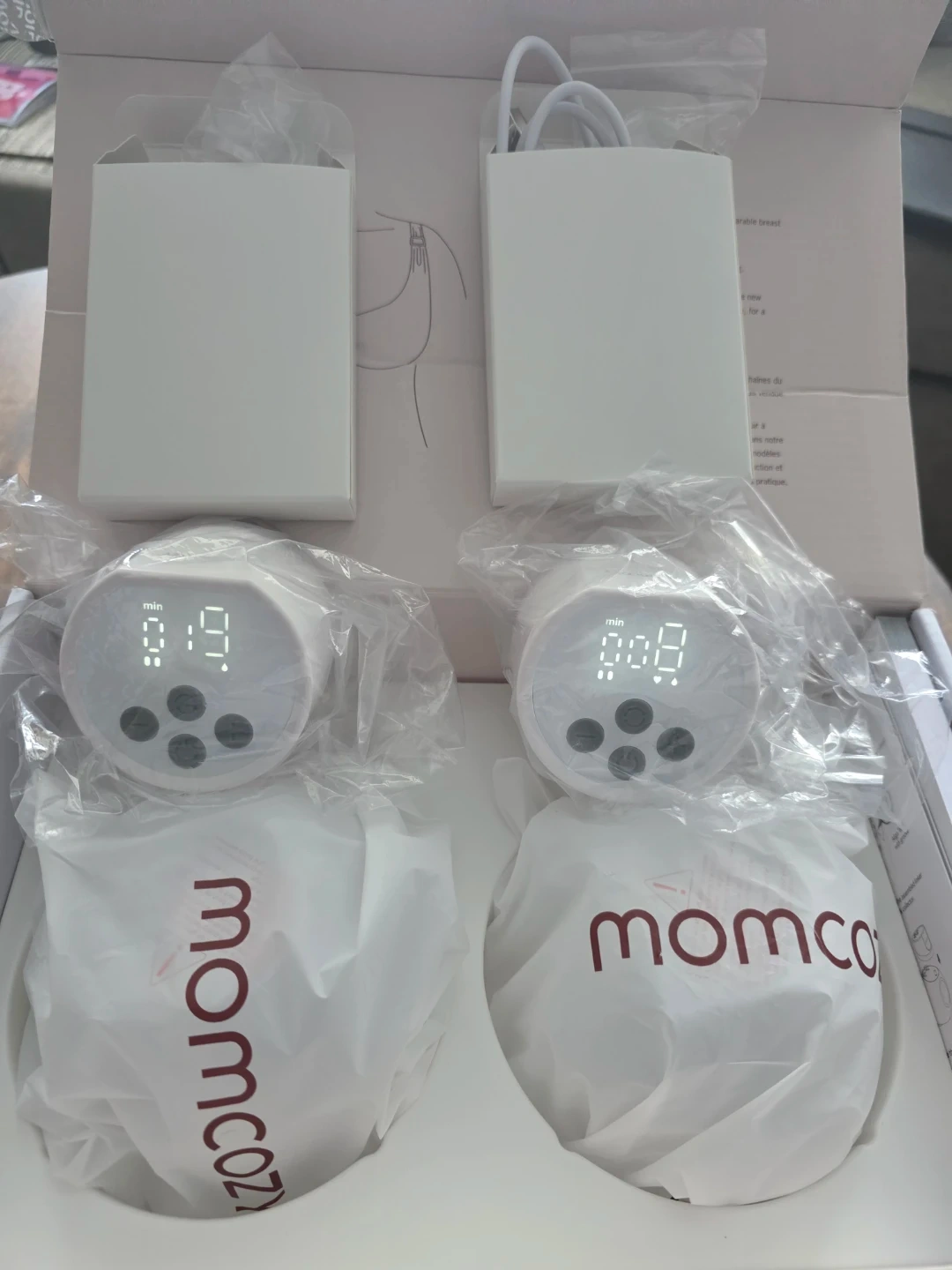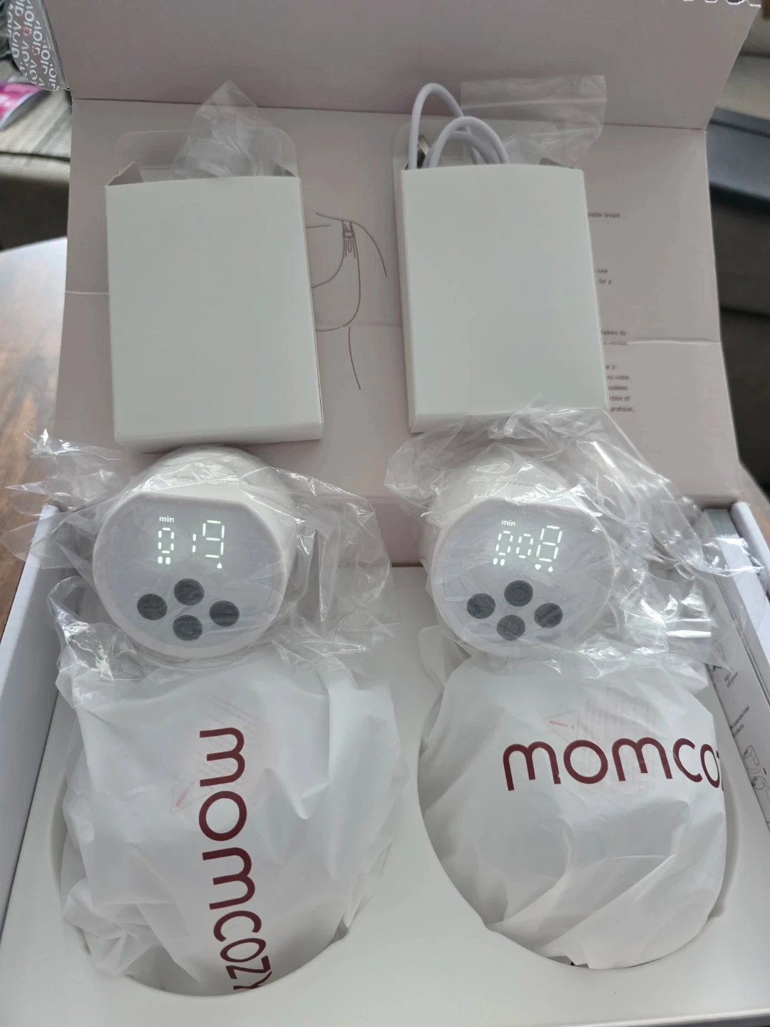 This Momcozy S12 Pro wearable breast pump is designed for discreet and portable use. It includes two pumps, charging cables, and a nipple measurement tool. This device offers adjustable settings for pumping sessions. New