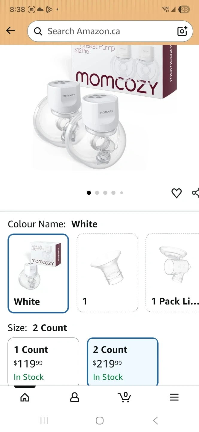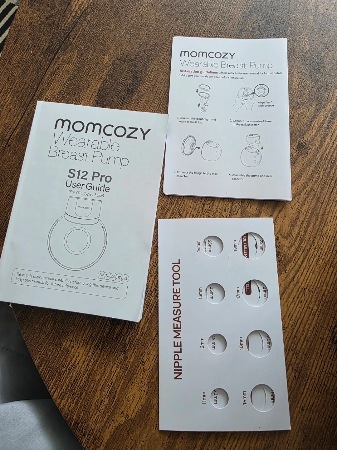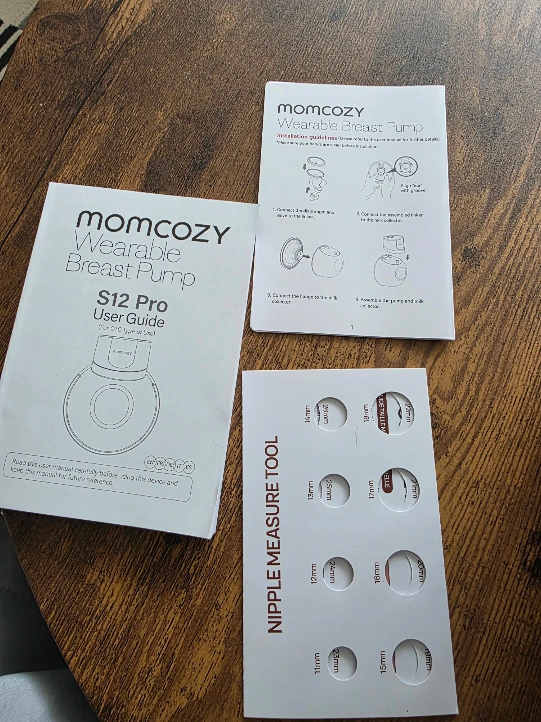 This Momcozy S12 Pro wearable breast pump is designed for discreet and portable use. It includes two pumps, charging cables, and a nipple measurement tool. This device offers adjustable settings for pumping sessions. New