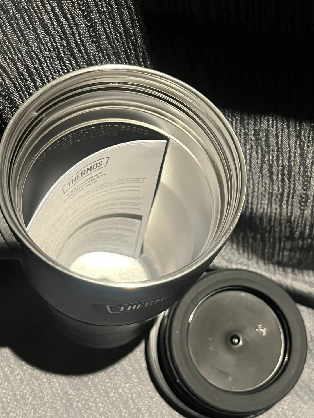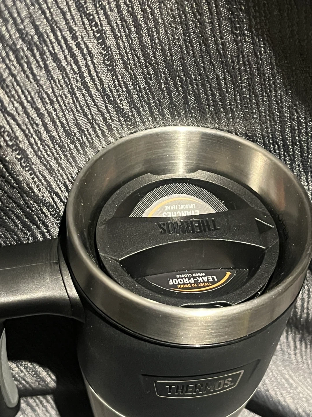 This Thermos travel tumbler is designed to keep drinks hot or cold. It's made with stainless steel and features a leak-proof lid when closed. Holds 16 oz or 470 ml.