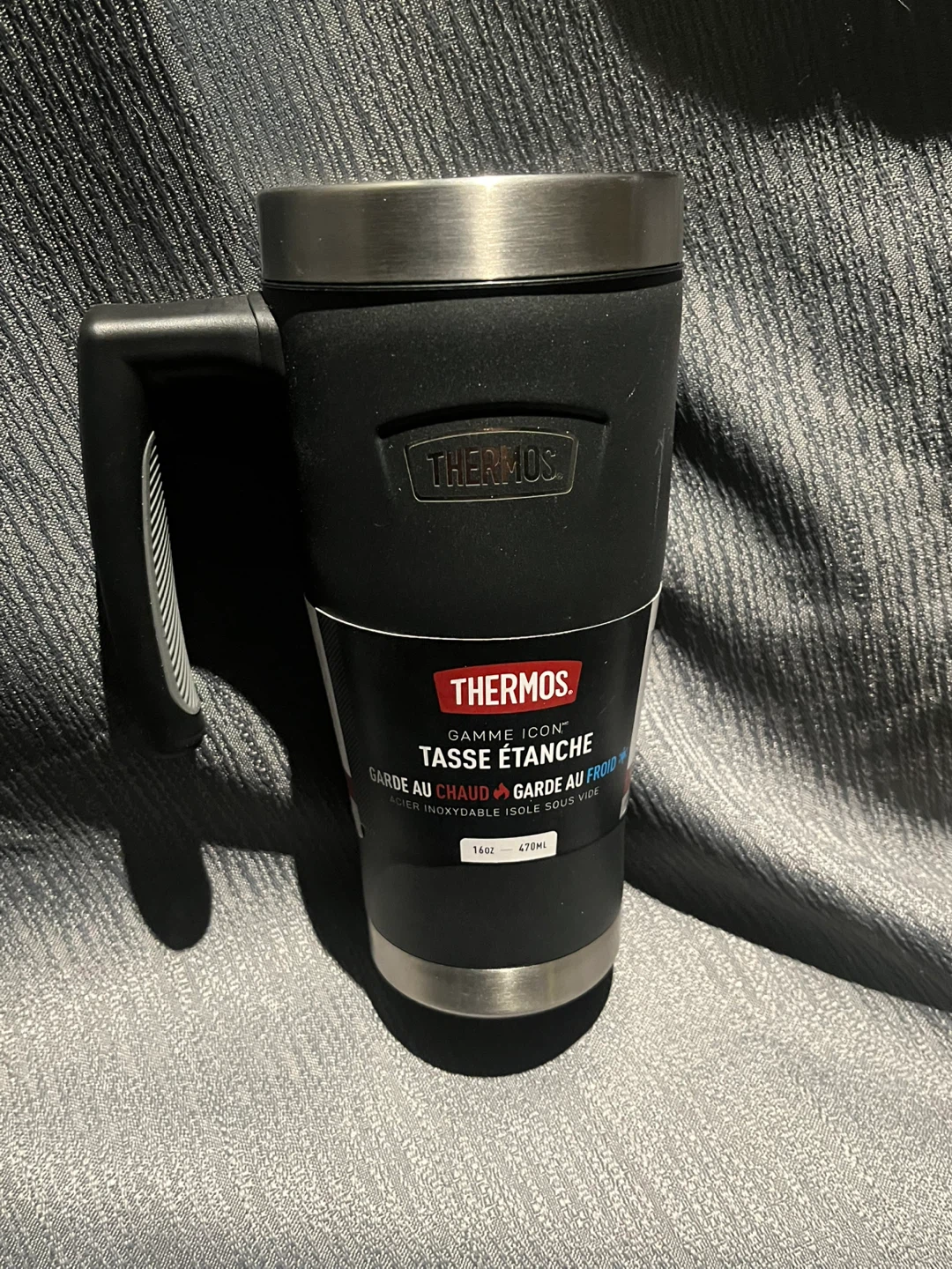 This Thermos travel tumbler is designed to keep drinks hot or cold. It's made with stainless steel and features a leak-proof lid when closed. Holds 16 oz or 470 ml.