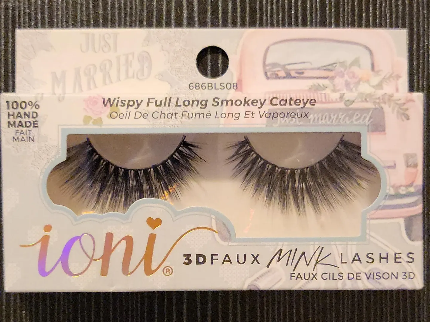 Ioni 3D Faux Mink Lashes in the 'Wispy Full Long Smokey Cateye style. These lashes are 100% hand-made and designed to be flexible. They offer reusable and lightweight wear for added volume and body.