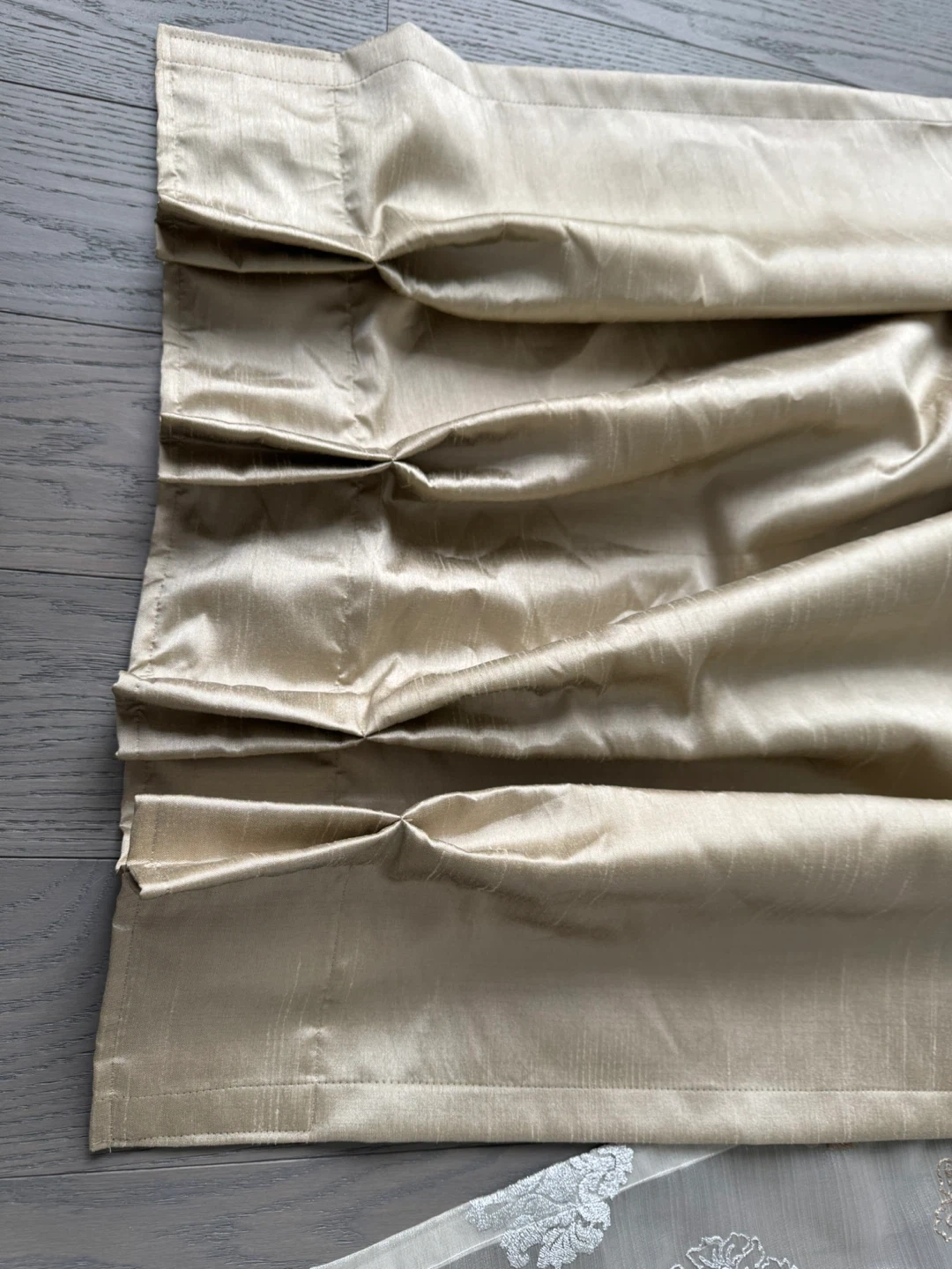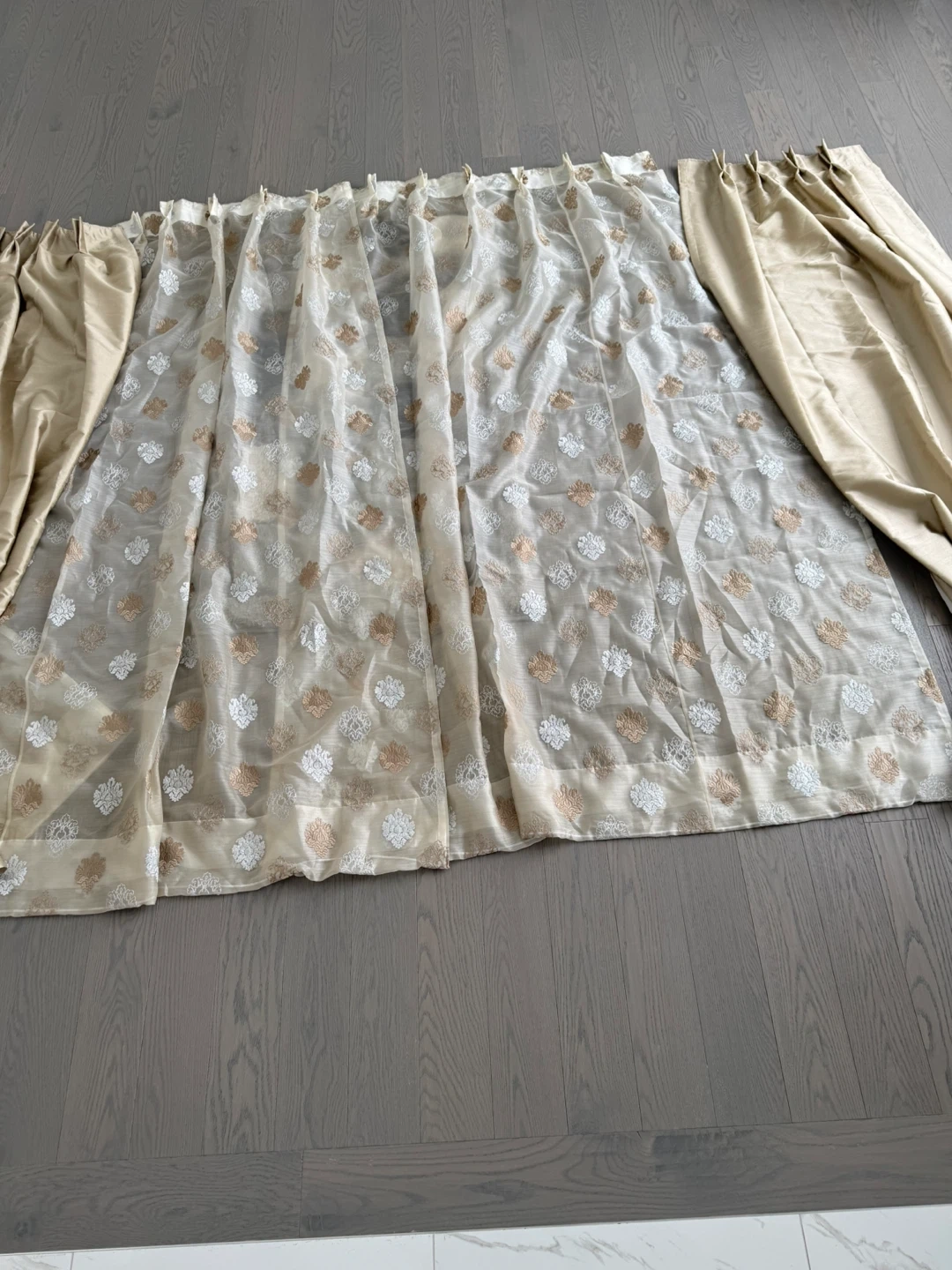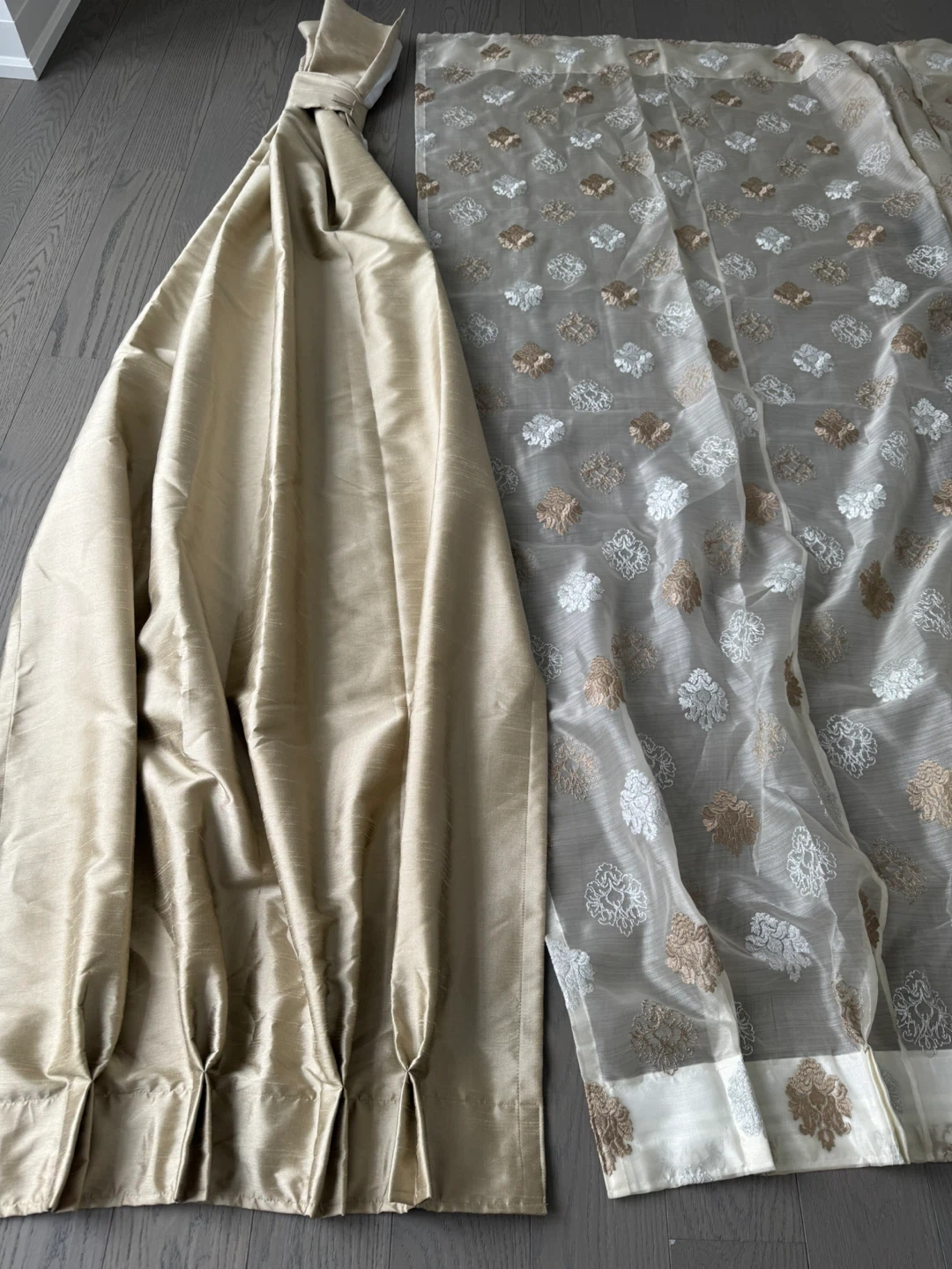 Sheer curtains featuring an all-over embroidered pattern in white and gold tones. A separate set of satin-like drapes in a champagne colour is also included. These curtains would add a touch of elegance to any room.