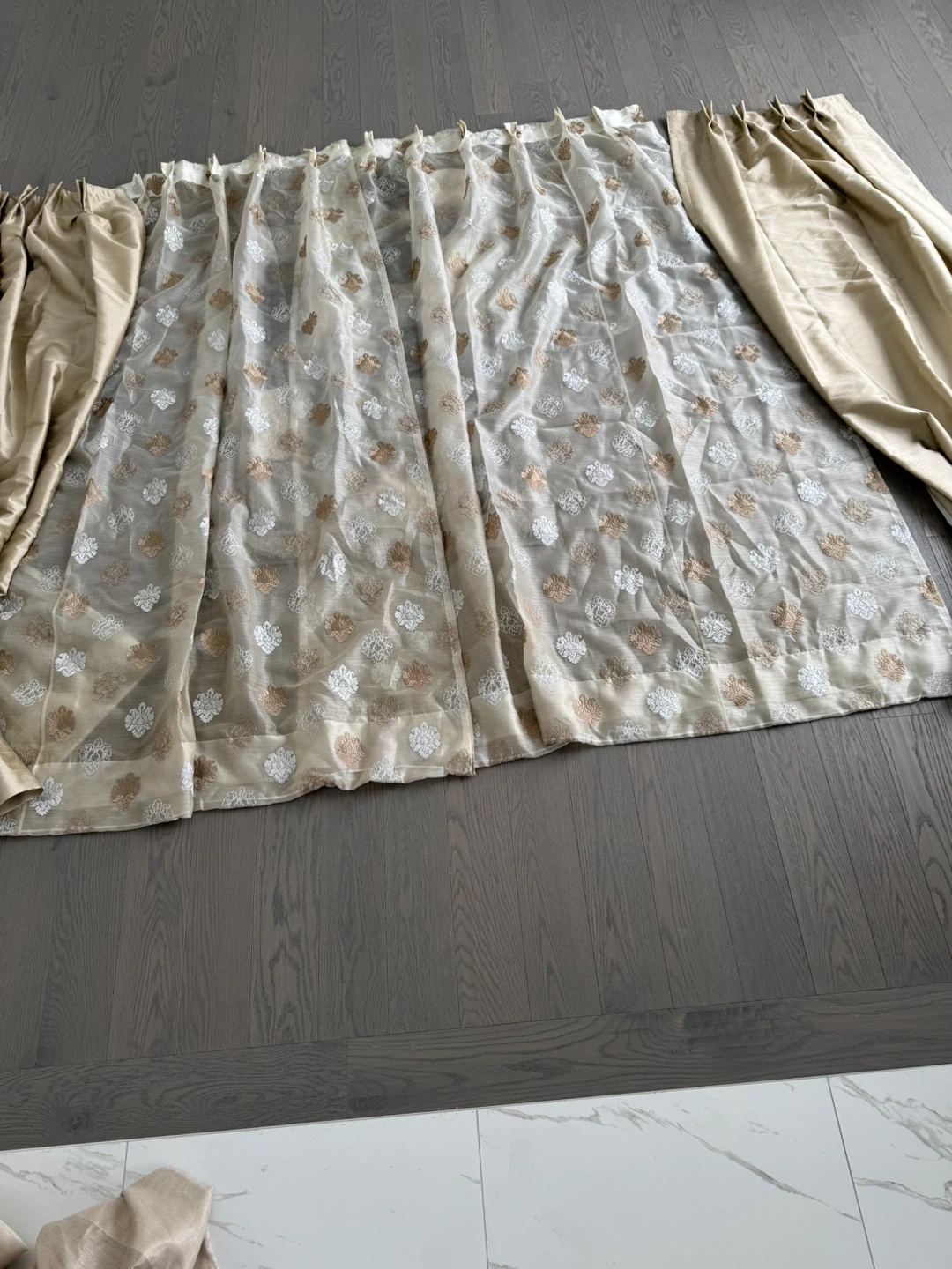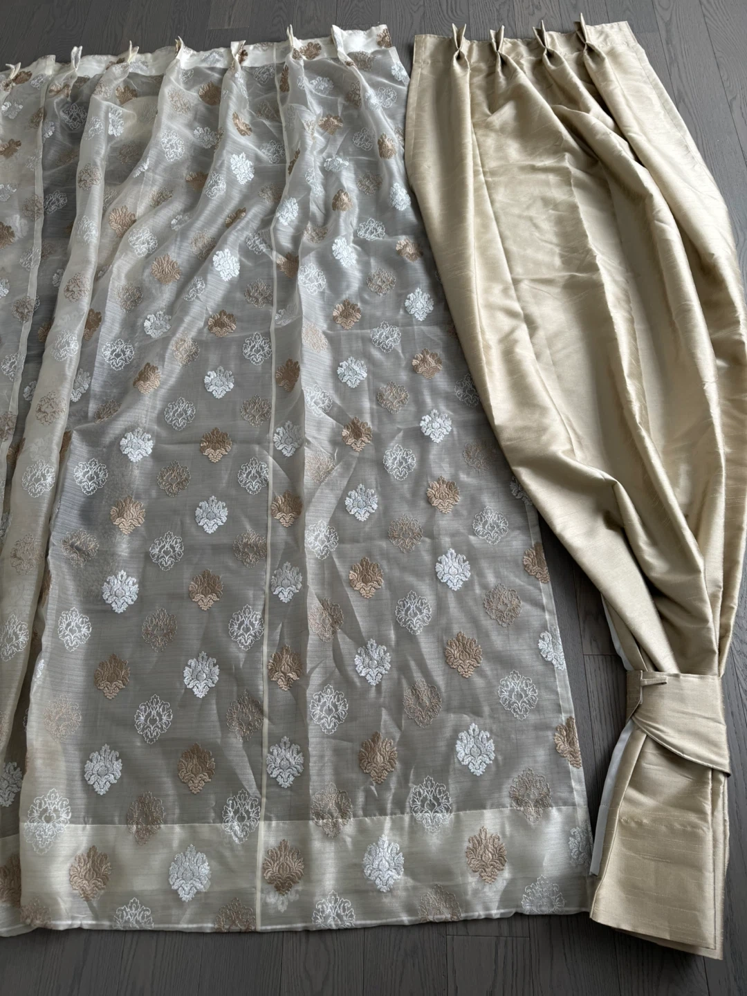 Sheer curtains featuring an all-over embroidered pattern in white and gold tones. A separate set of satin-like drapes in a champagne colour is also included. These curtains would add a touch of elegance to any room.