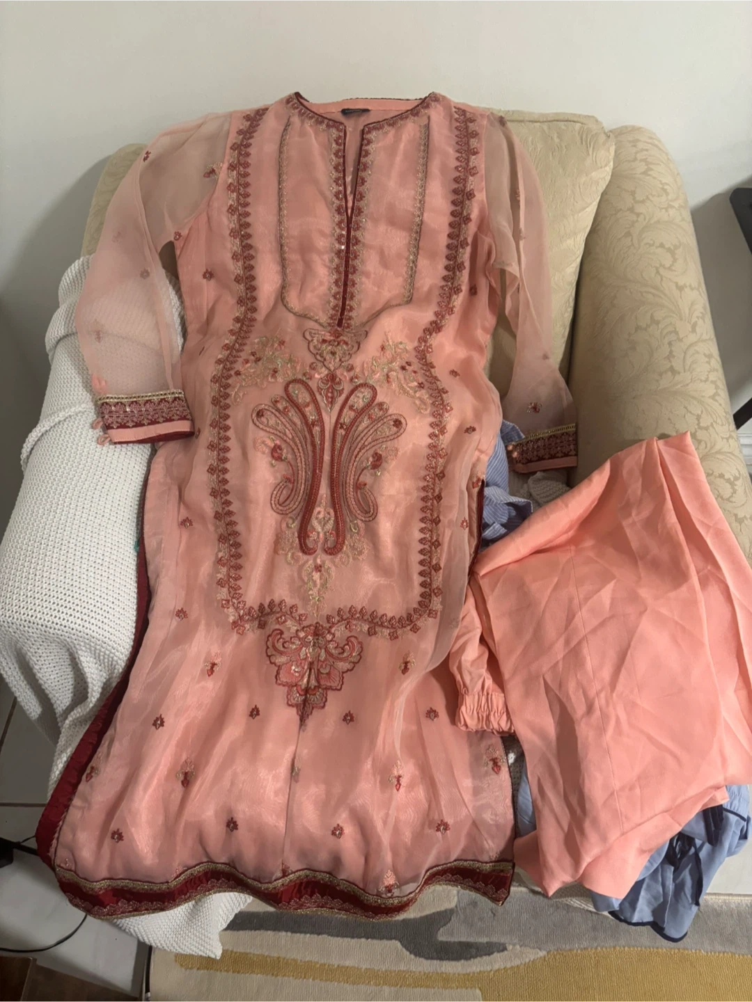 Selling a beautiful peach-coloured salwar kameez suit with intricate embroidery. Perfect for special occasions or festive wear. It includes the kameez (top), salwar (bottoms),