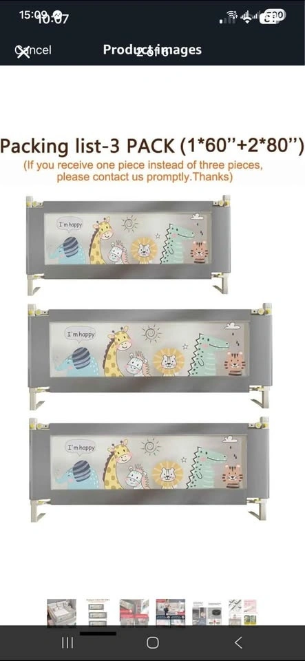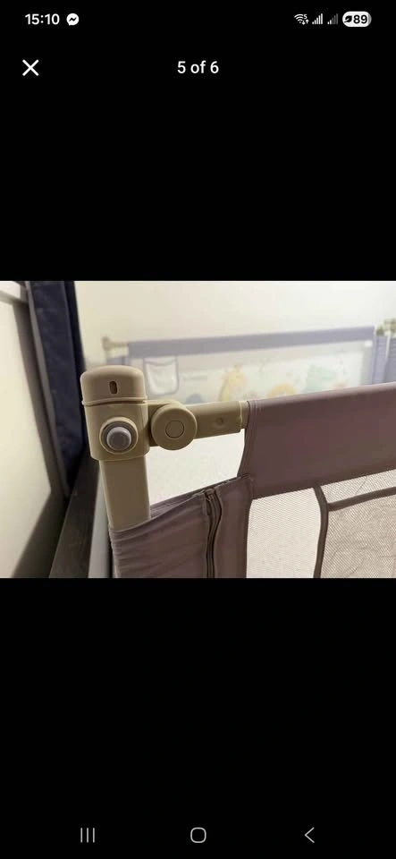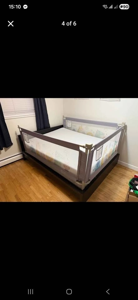 We bought a king bed with built-in rails when we moved into our new place, so we don’t need these anymore. Fits queen-size bed. Sturdy metal frame with breathable mesh panels. Neutral beige/cream color with a cute animal print design. Soft padded top rail for extra safety. High coverage for added fall protection. Easy to install and remove. Folds down for easy access to the bed. Great for toddlers transitioning to a big bed or co-sleeping.