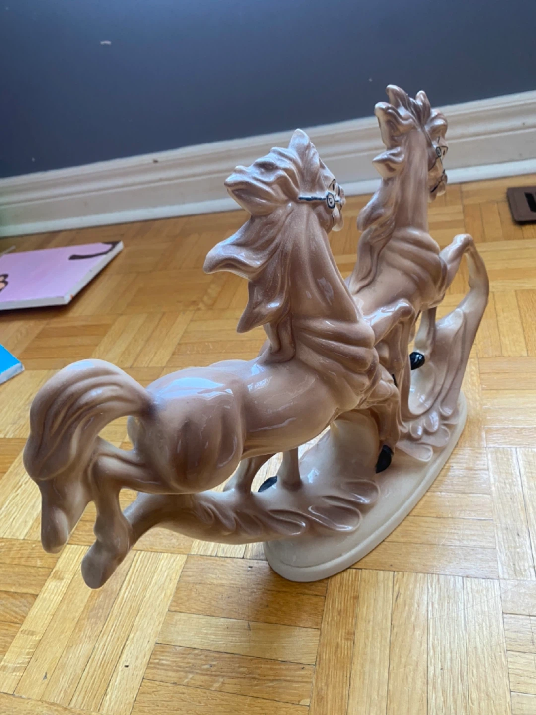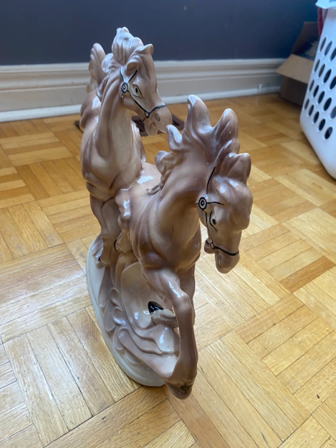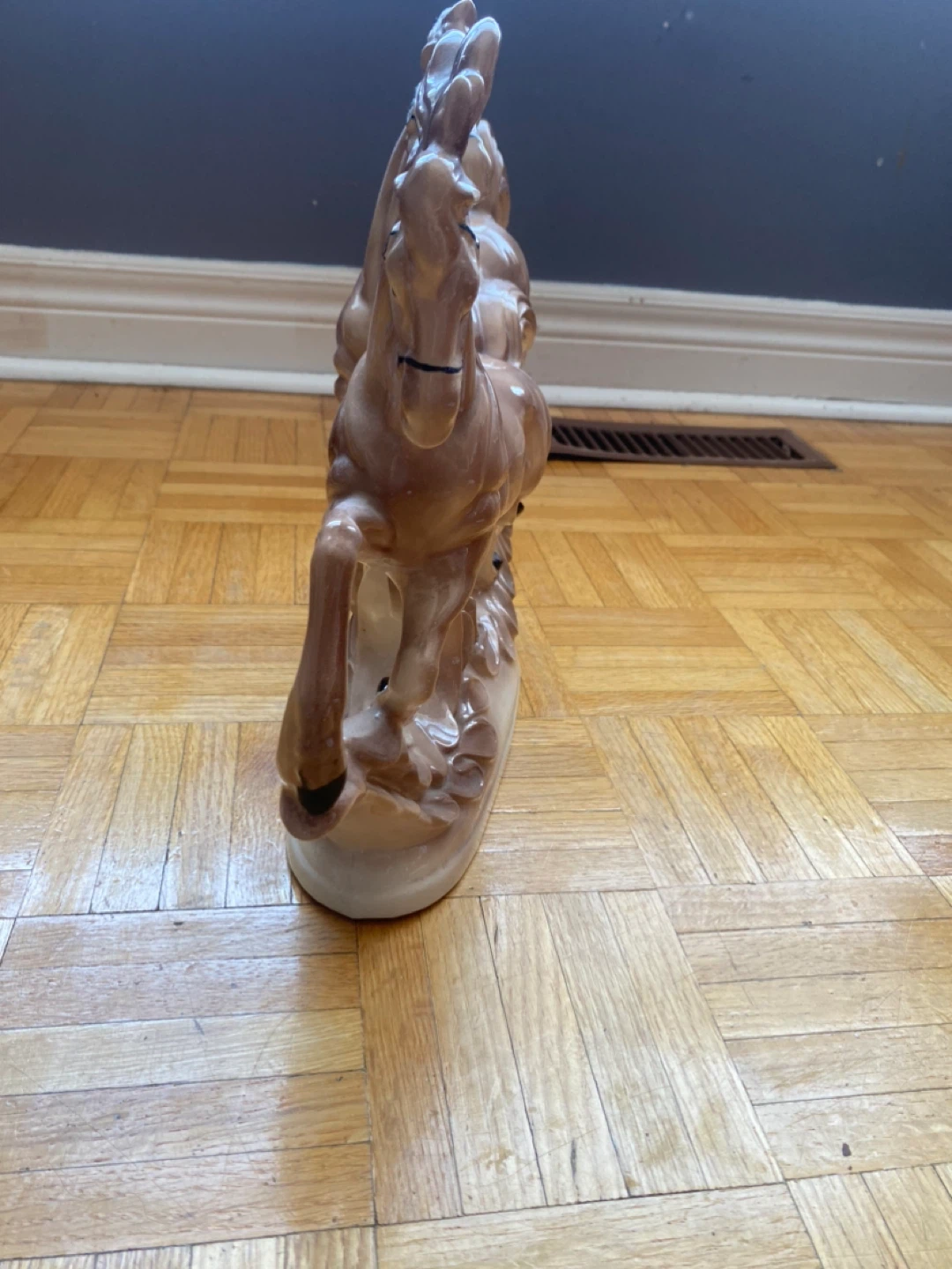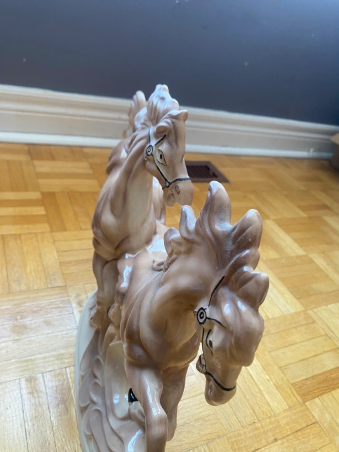This is a ceramic statue featuring two horses. It measures approximately 11 inches tall. It's a nice decorative piece.