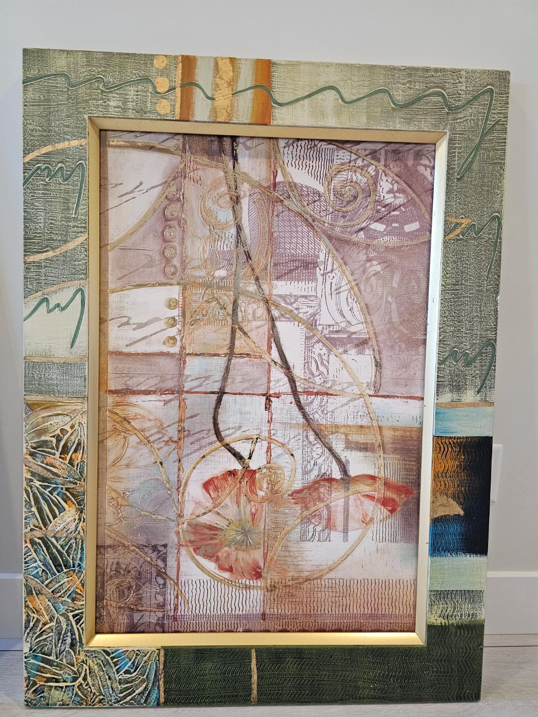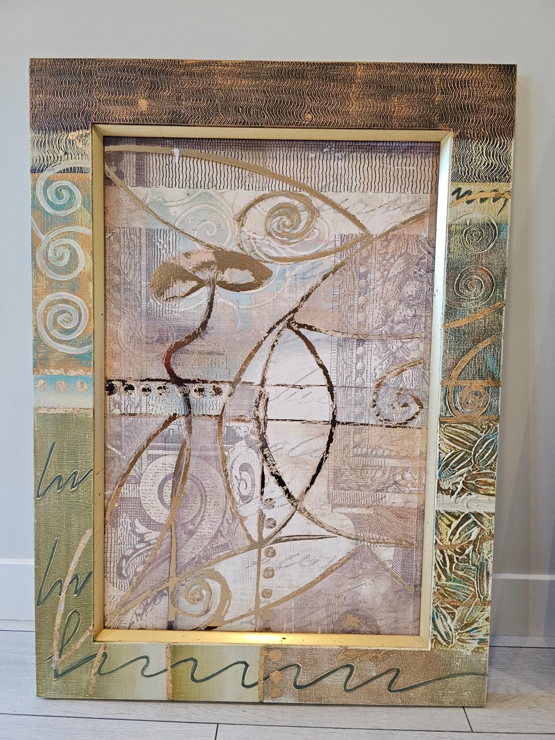 Two decorative framed pieces with hand painted abstract style artwork. Each piece features a unique textured frame and intricate collage elements with metallic gold accents. They'd add a unique touch to any room's decor!