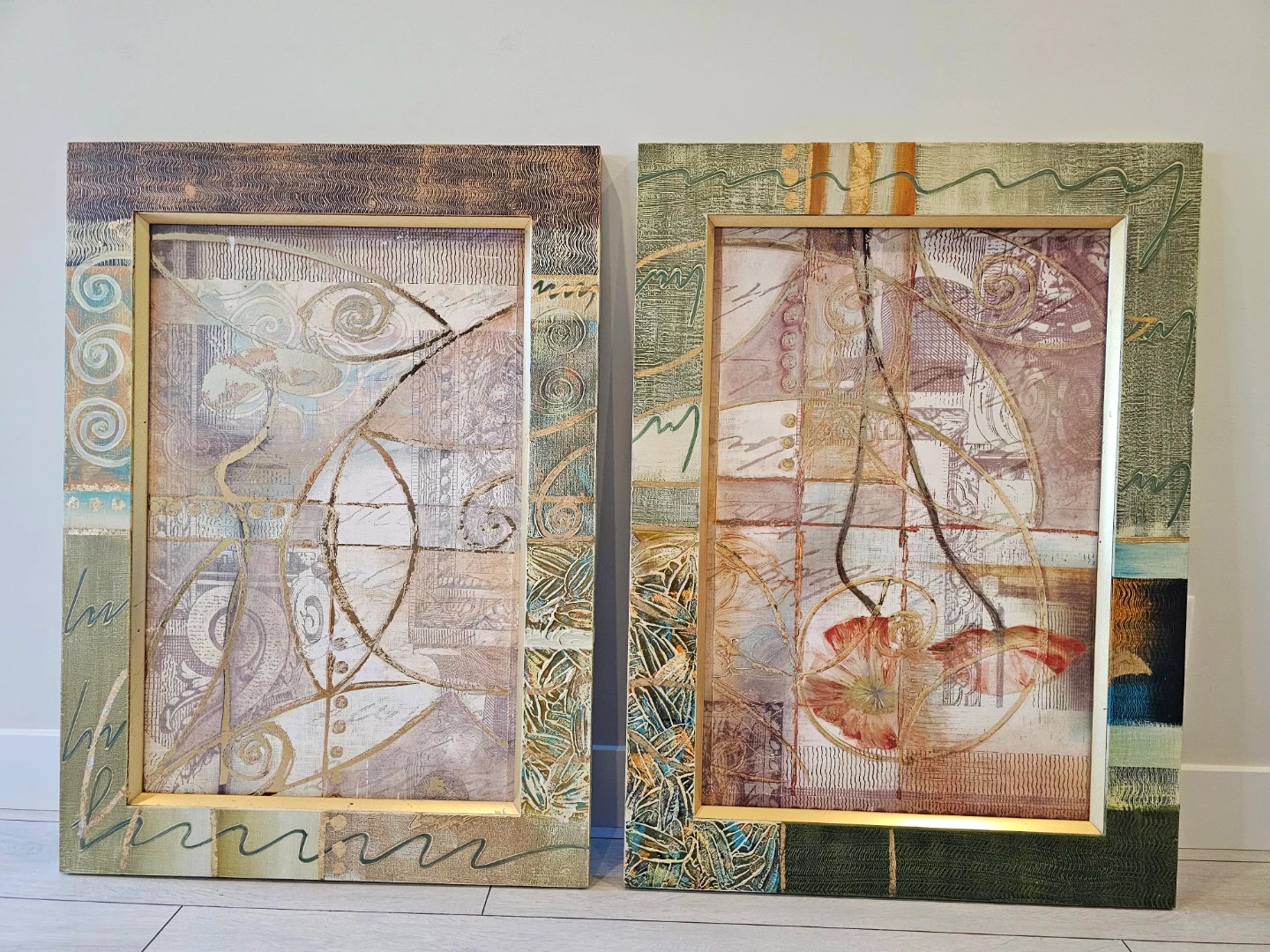 Two decorative framed pieces with hand painted abstract style artwork. Each piece features a unique textured frame and intricate collage elements with metallic gold accents. They'd add a unique touch to any room's decor!