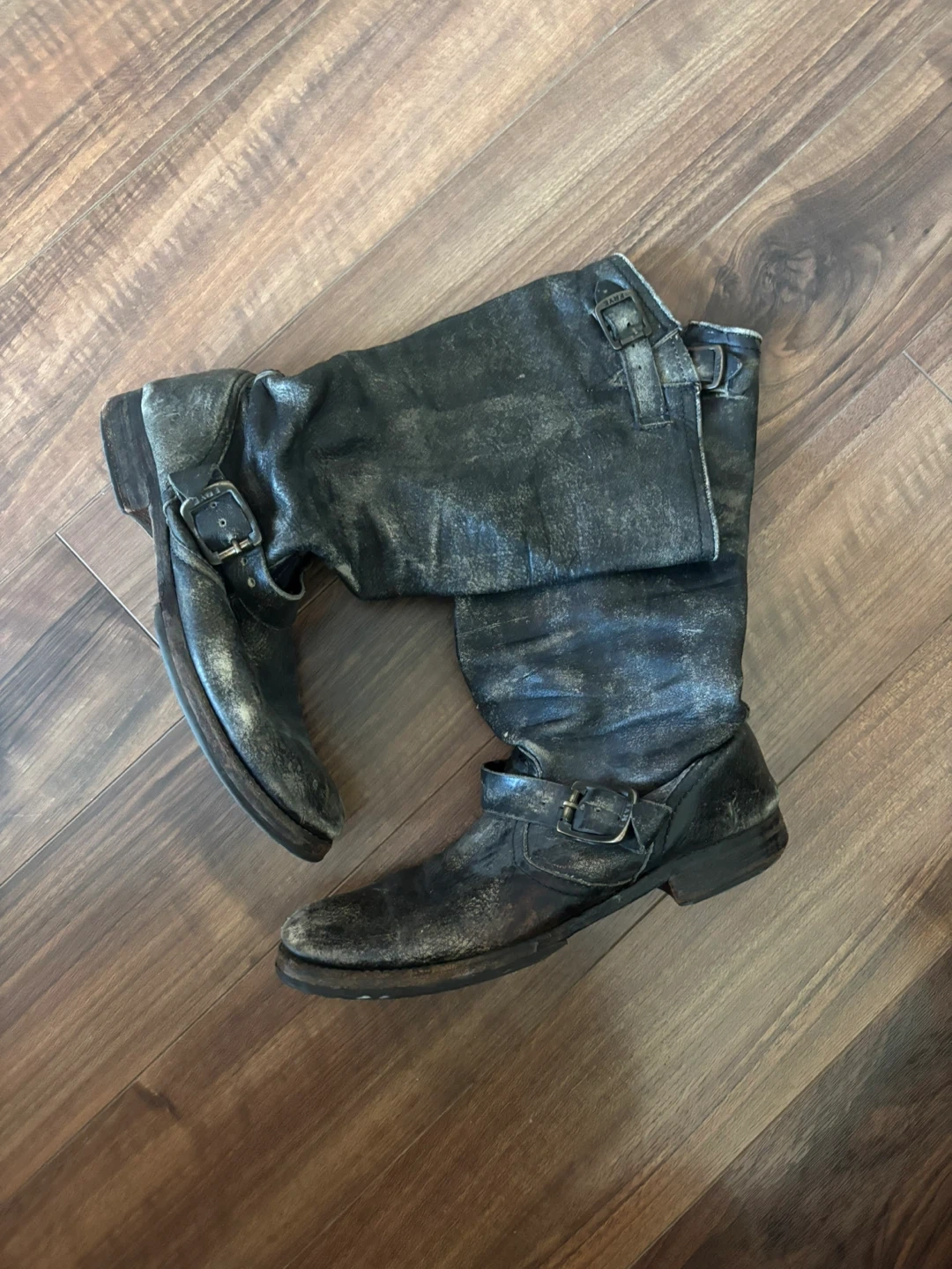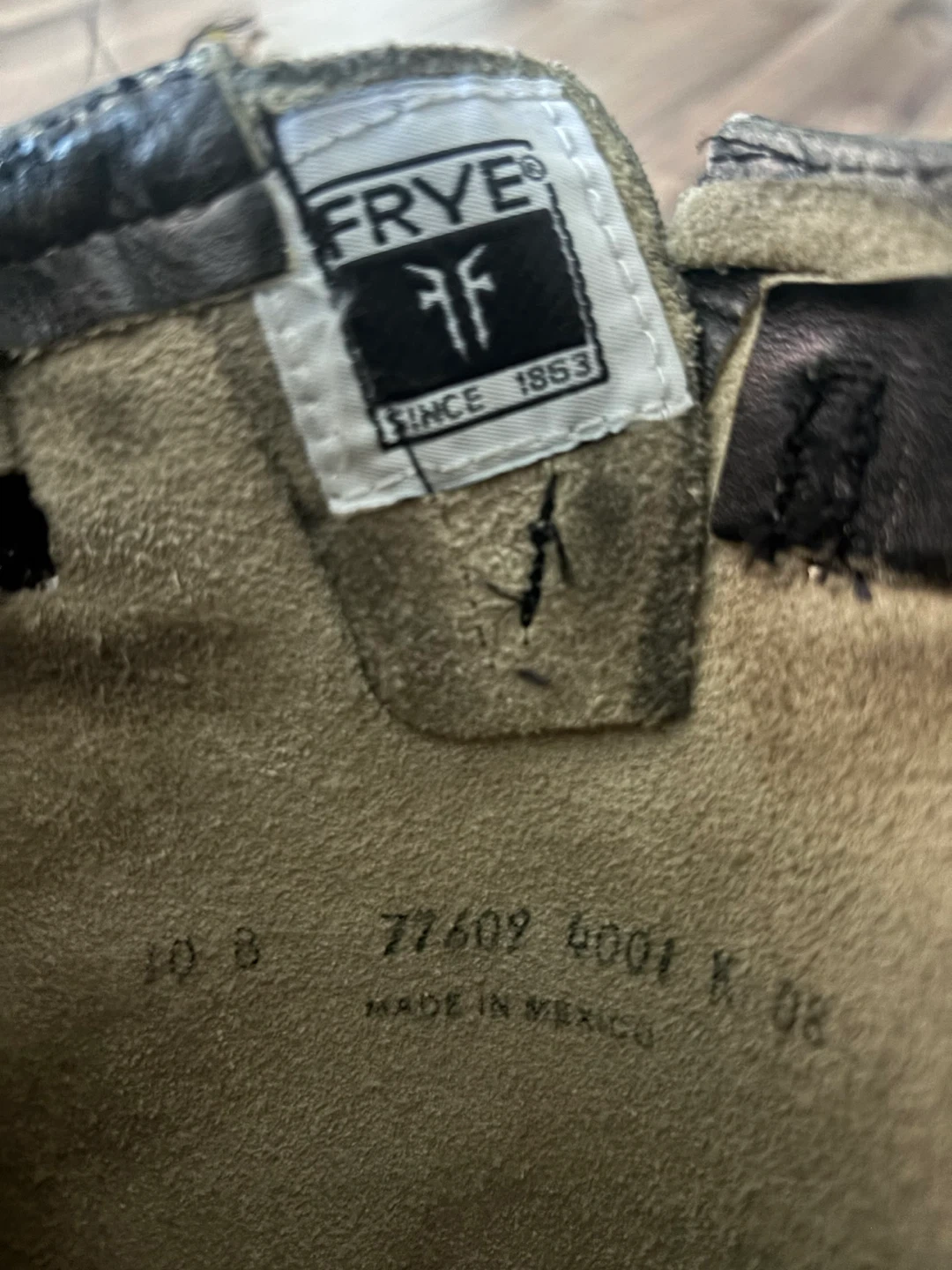 These are stylish FRYE black leather motorcycle boots. They are made in Mexico and feature buckle details. Leather.