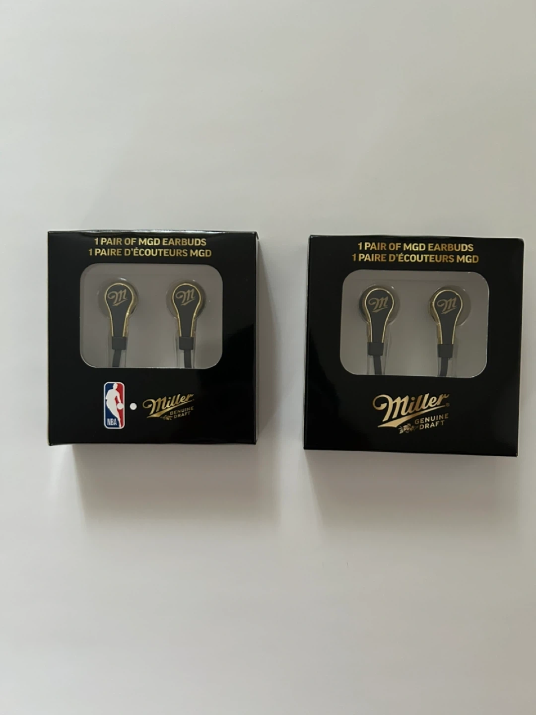 Brand New Miller Genuine Draft MGD earbuds. 2 packs available. $5 per pack. Features the classic Miller logo and NBA branding. Includes original packaging. Public meet Warden and highway 7 in Markham. Cash only please.