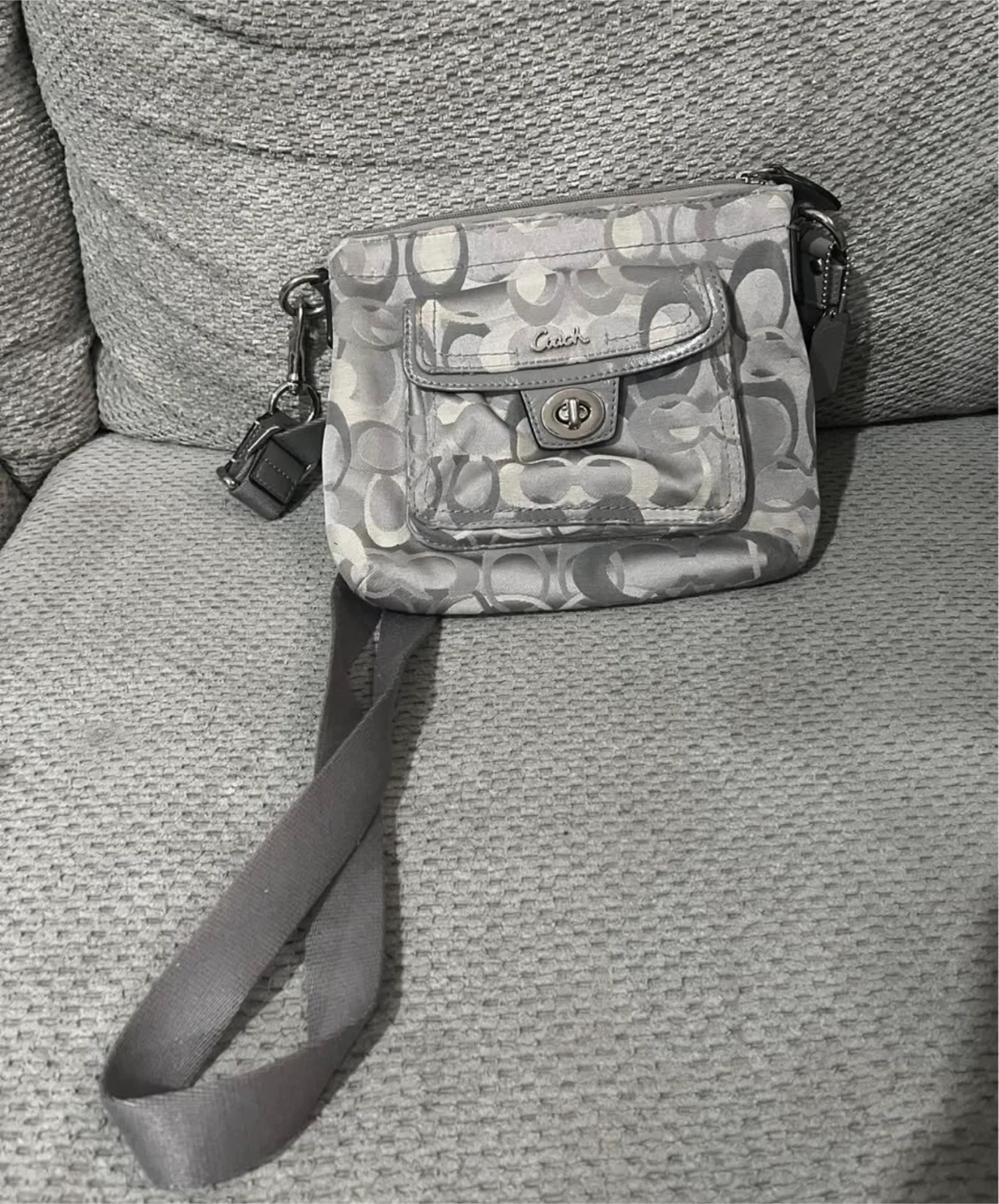 This is a pre-loved Coach crossbody bag featuring the iconic signature 'C' monogram pattern. It's a stylish silver colour with a front flap pocket and a turn-lock closure. The adjustable strap makes it comfortable to wear.