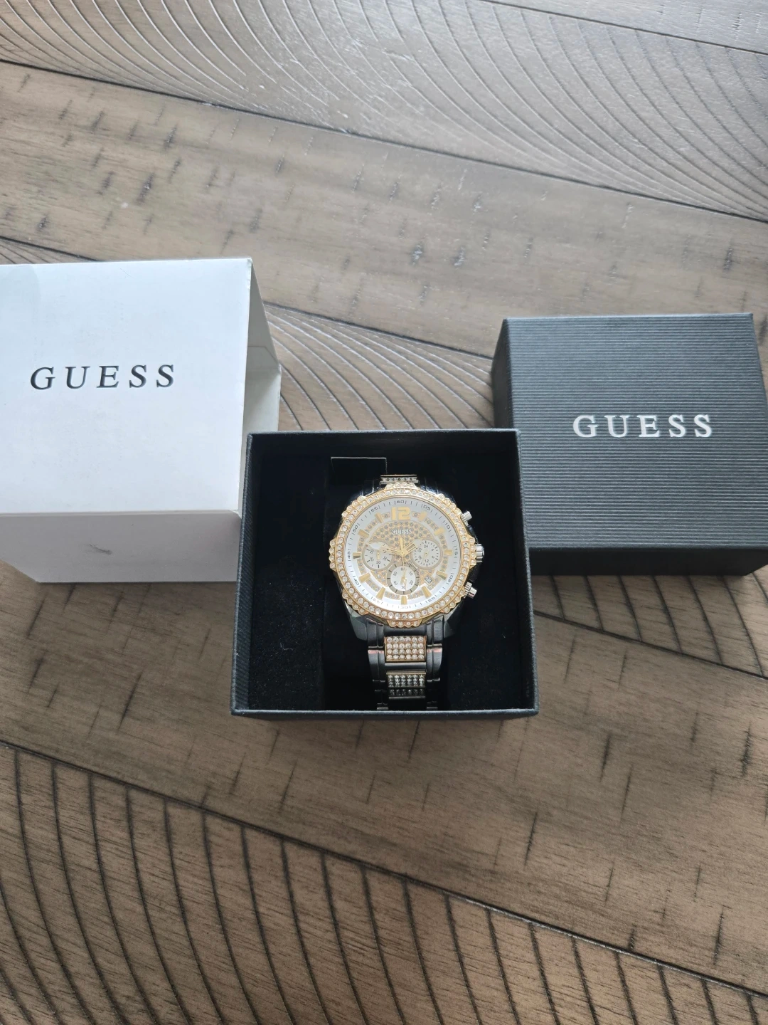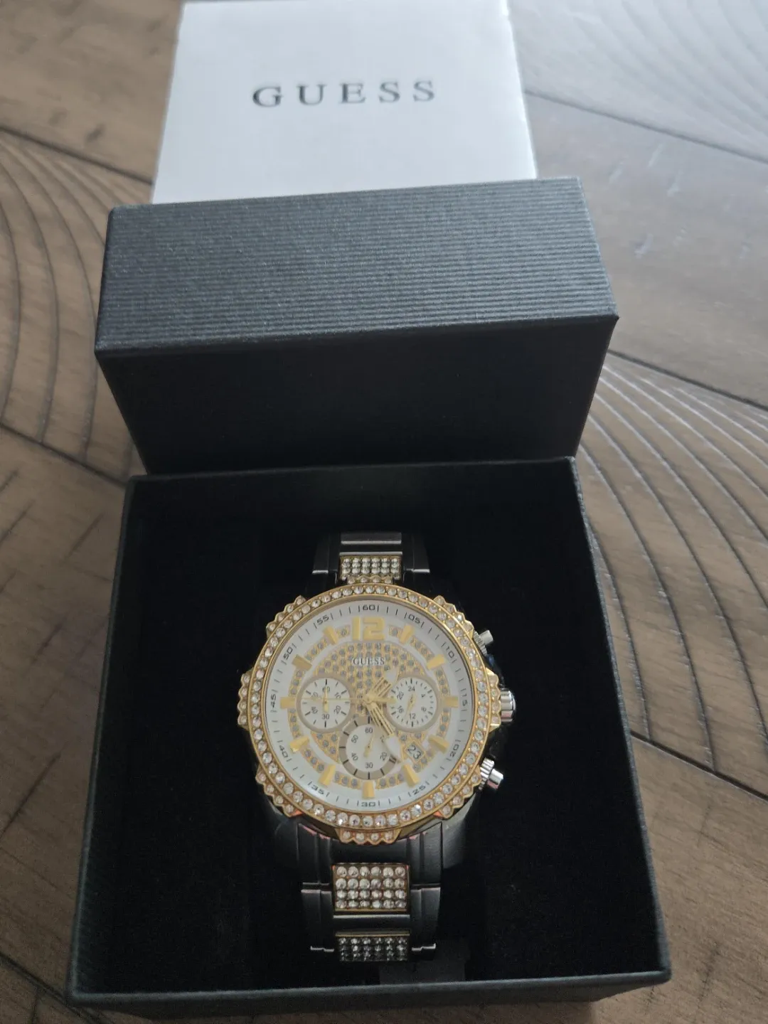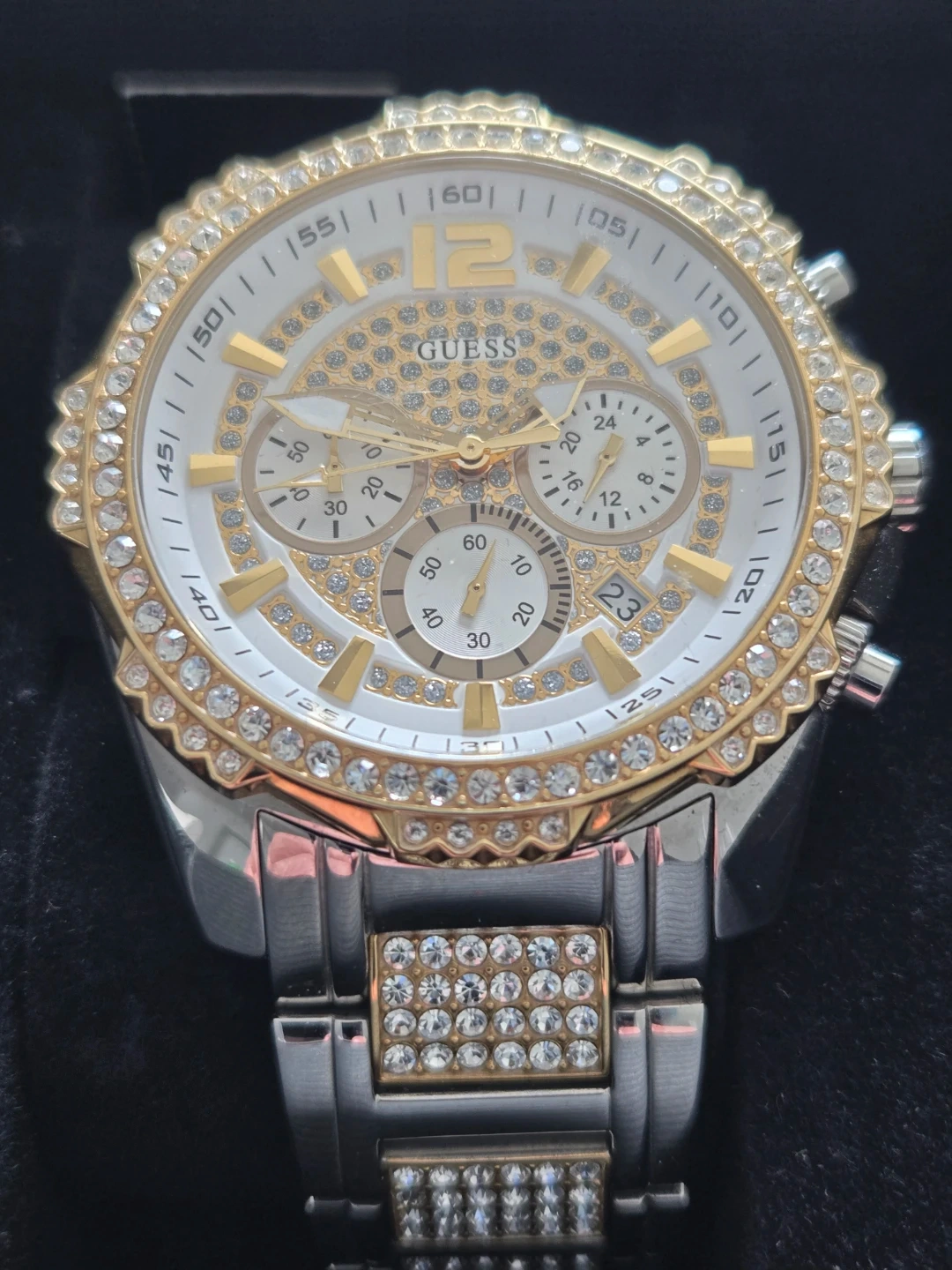 This GUESS chronograph watch boasts a crystal-accented bezel and band. It's a stylish timepiece with a white dial featuring gold-tone markers and sub-dials. Includes original GUESS box. Suitable for dressing up any outfit!