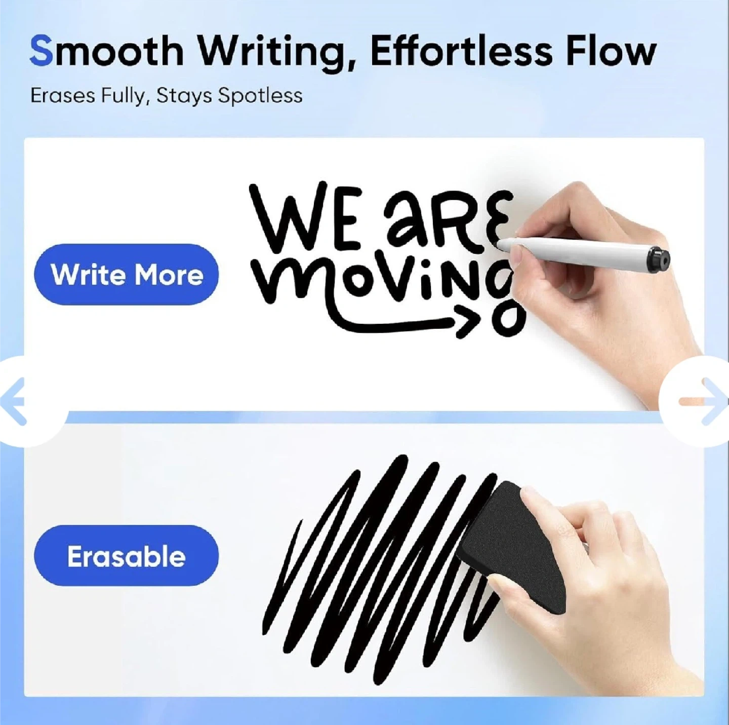 This VlSign whiteboard measures 36" by 48". It's a magnetic dry-erase board. Includes magnetic eraser, pins, and markers. New condition.
