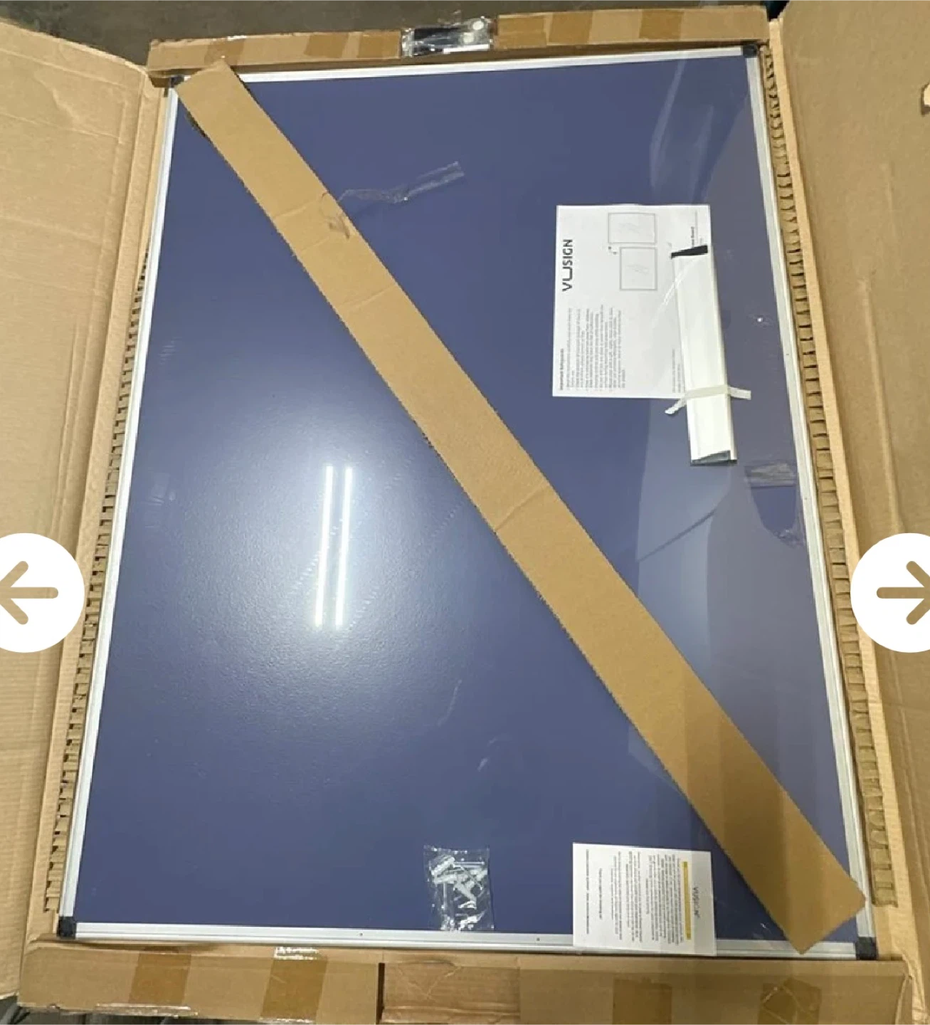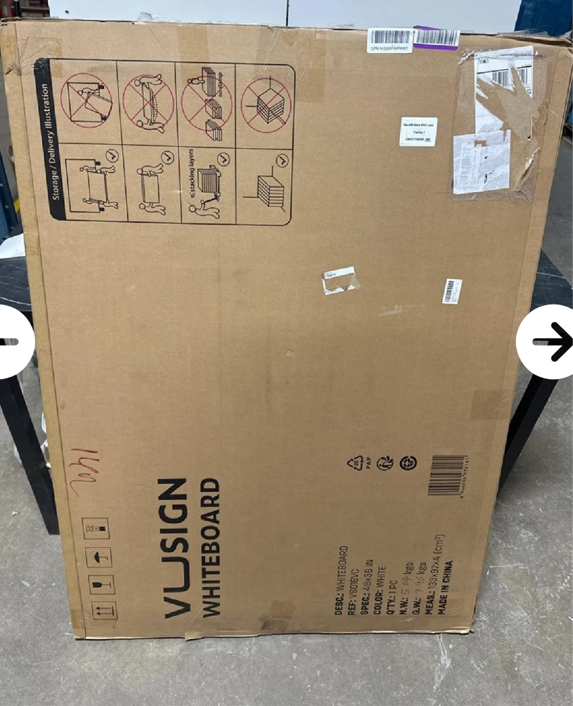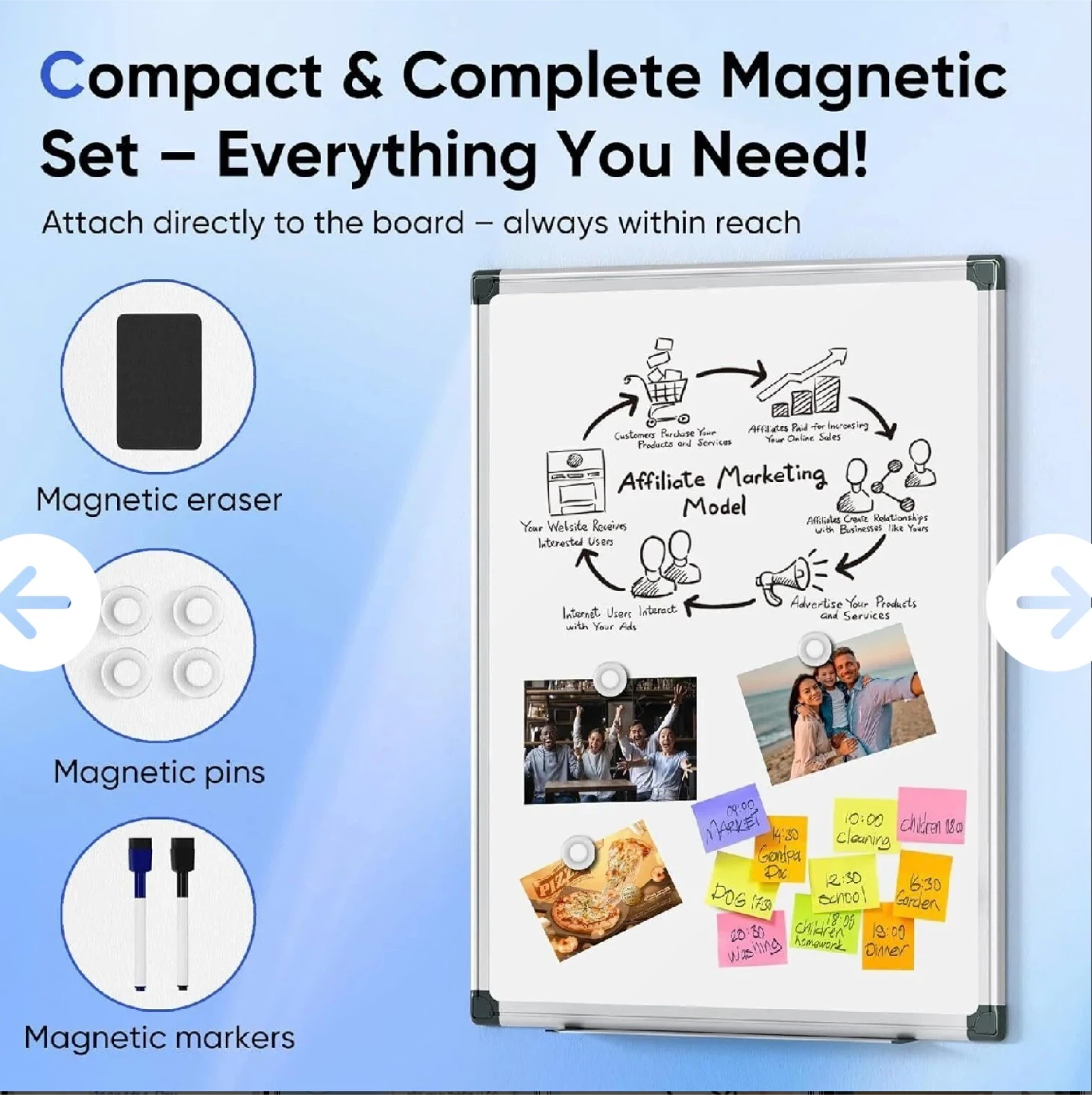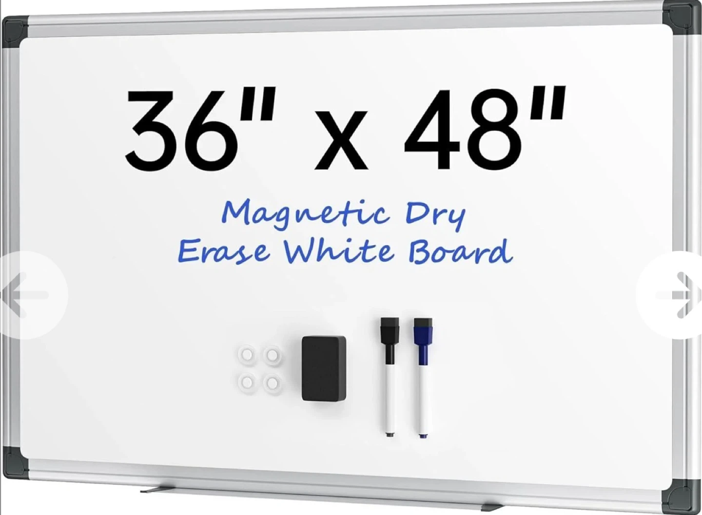 This VlSign whiteboard measures 36" by 48". It's a magnetic dry-erase board. Includes magnetic eraser, pins, and markers. New condition.