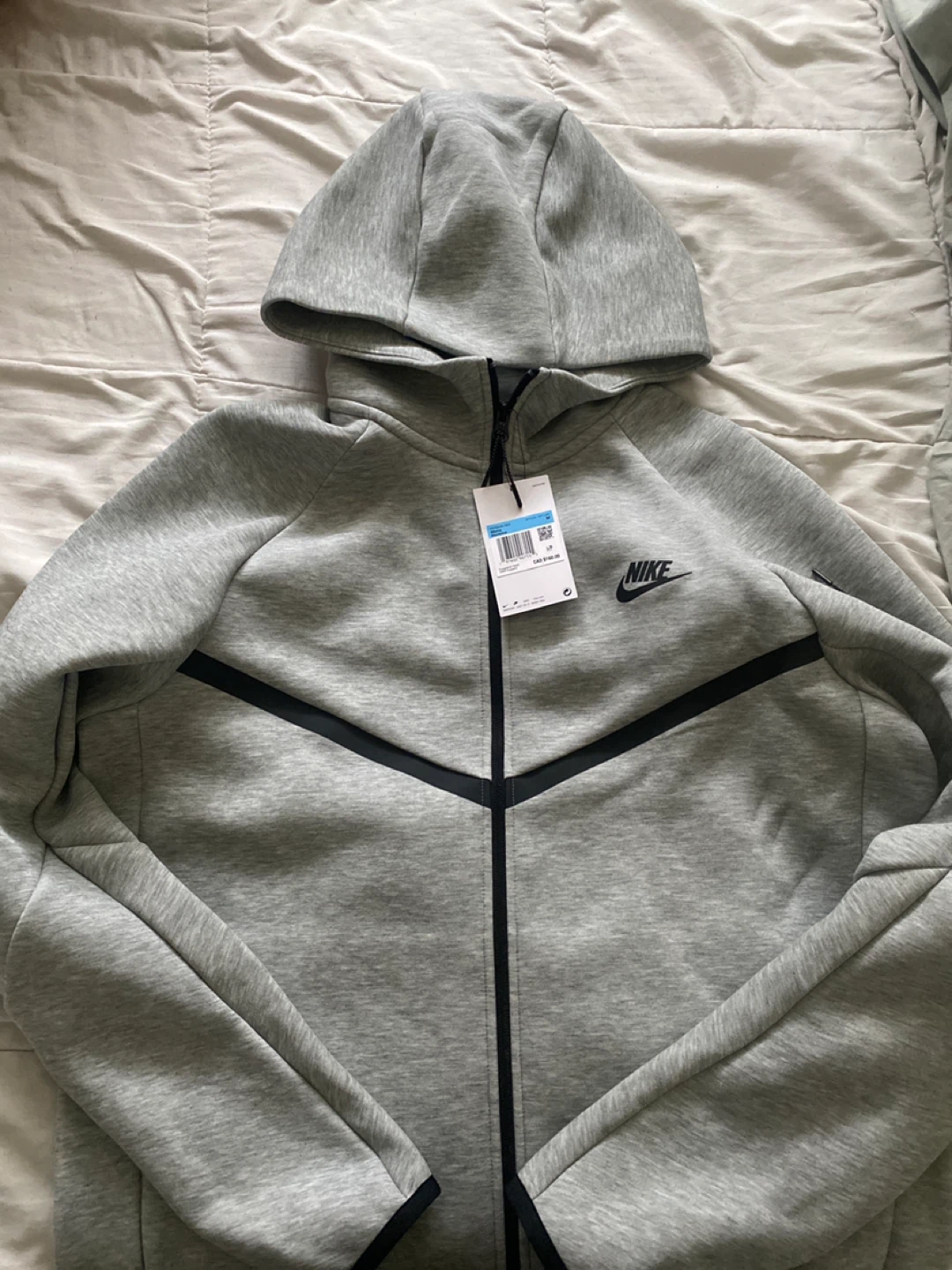 This is a Nike Tech Fleece full-zip hoodie in grey. It's made with a blend of cotton and polyester. Zippered pockets are included for secure storage.