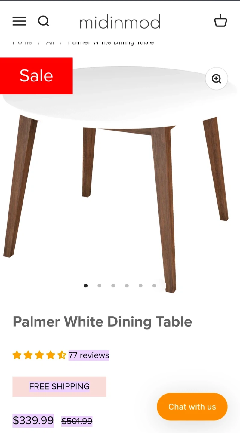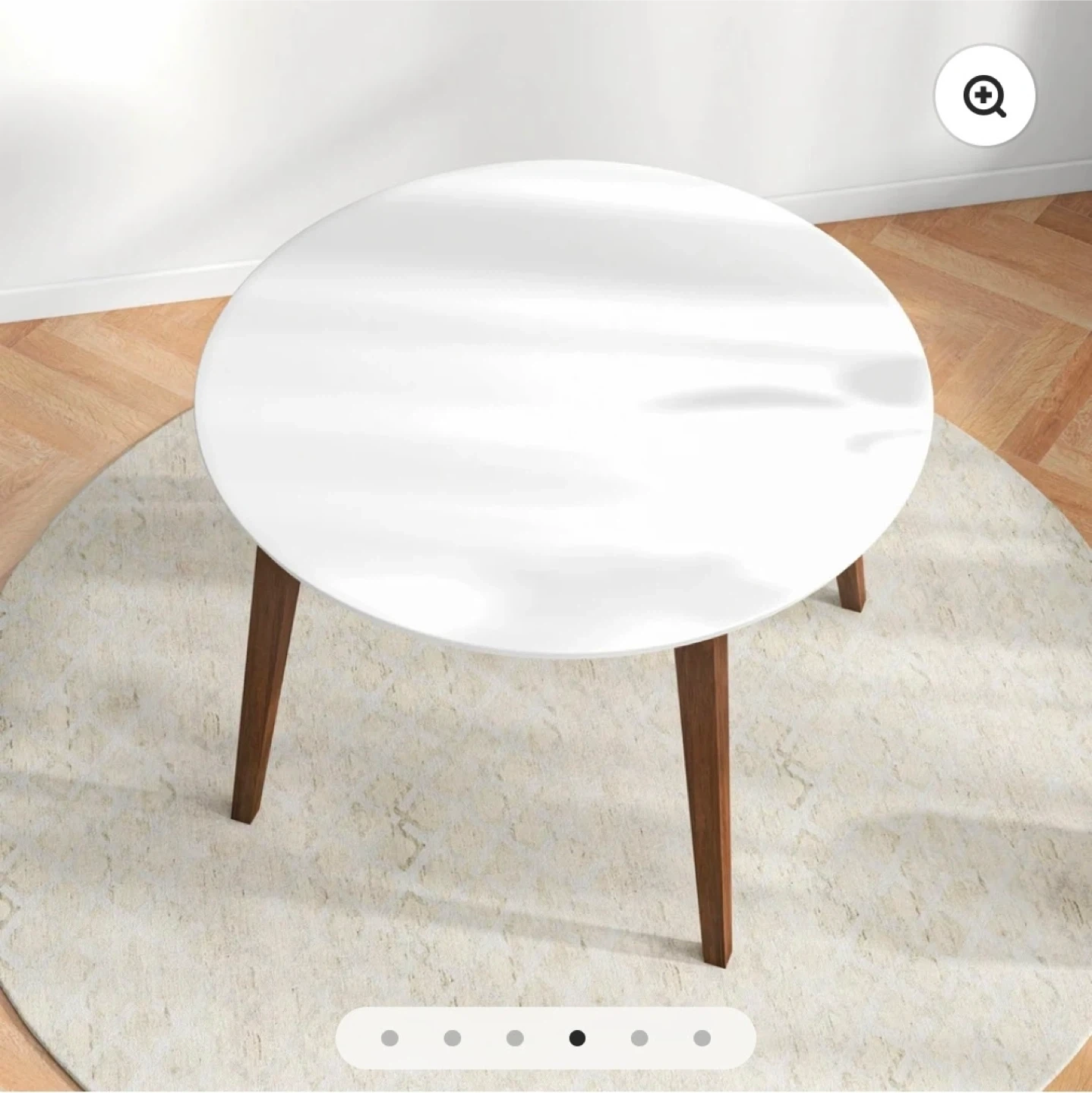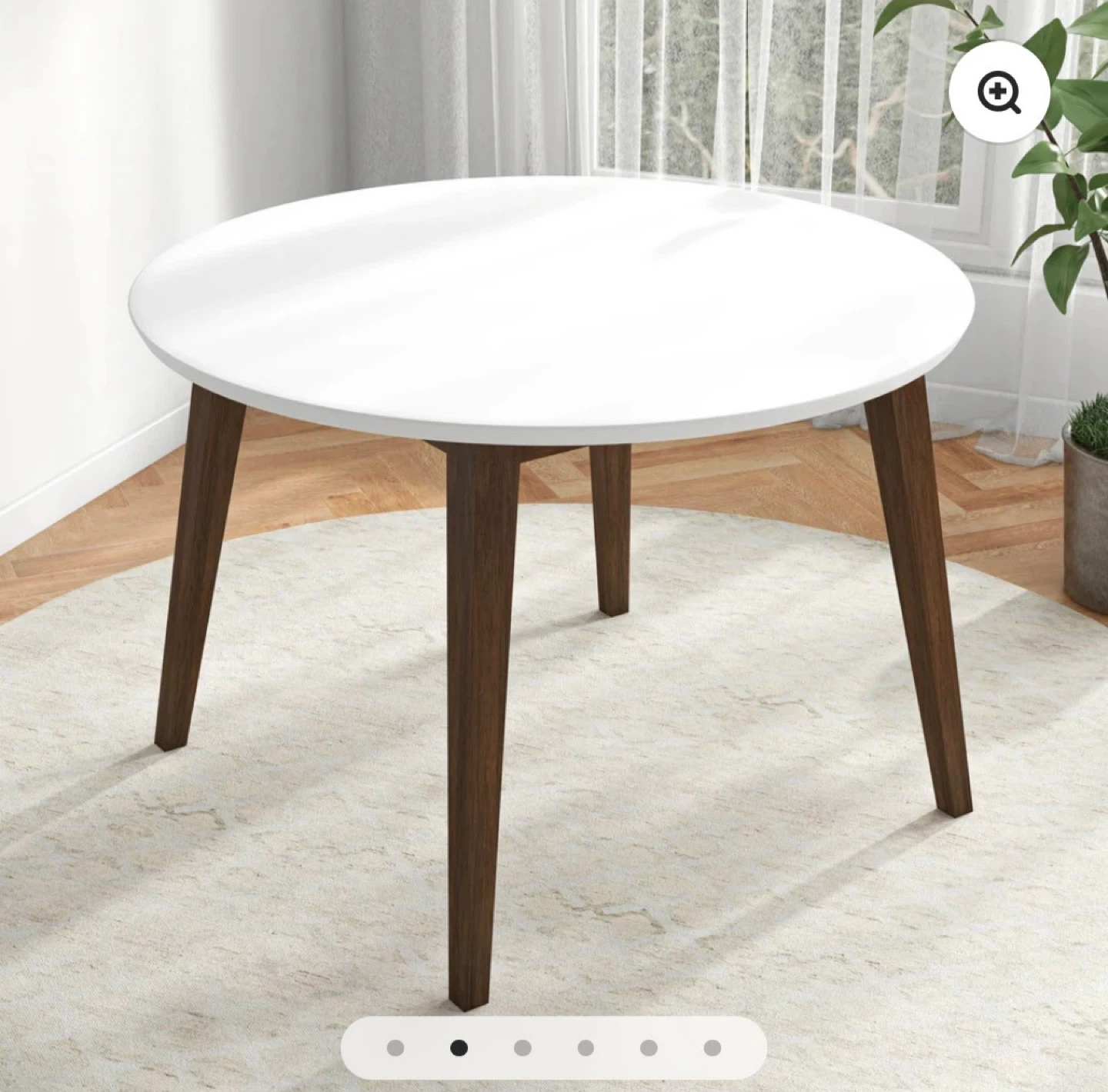 This round dining table features a white laminate top and solid wood legs. Its simple, mid-century modern design makes it a stylish addition to any dining space. Table dimensions: 35.5" W x 35.5" D x 29.5" H.