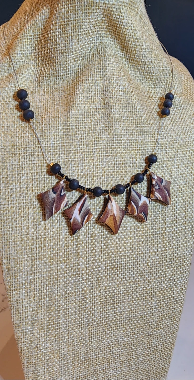 Unique handmade necklace featuring a mix of brown, white, and black beads. The design includes geometric shaped pendants and smaller round beads, strung on a delicate wire. This necklace is a statement piece that adds a touch of artistry to any outfit!
