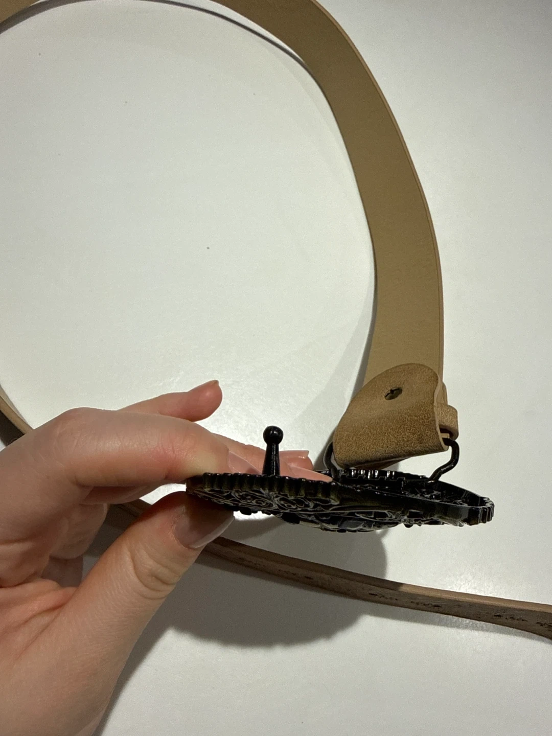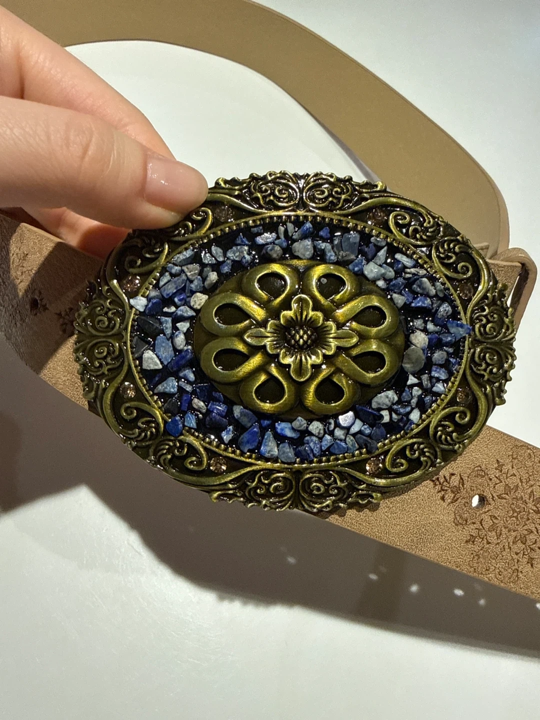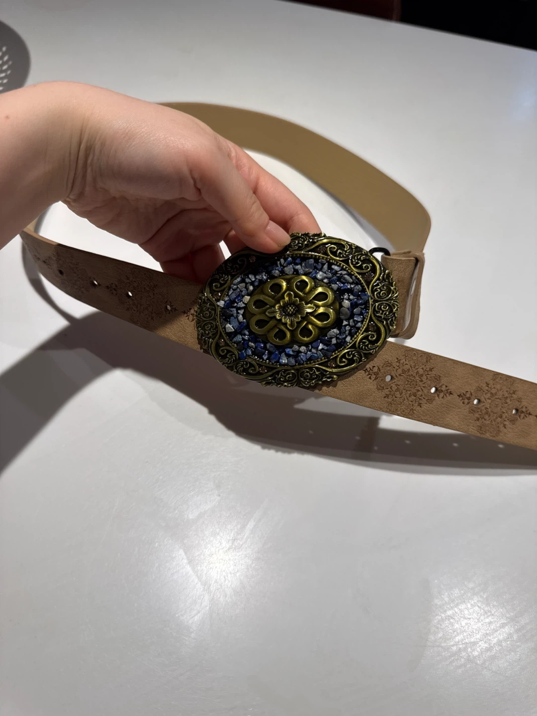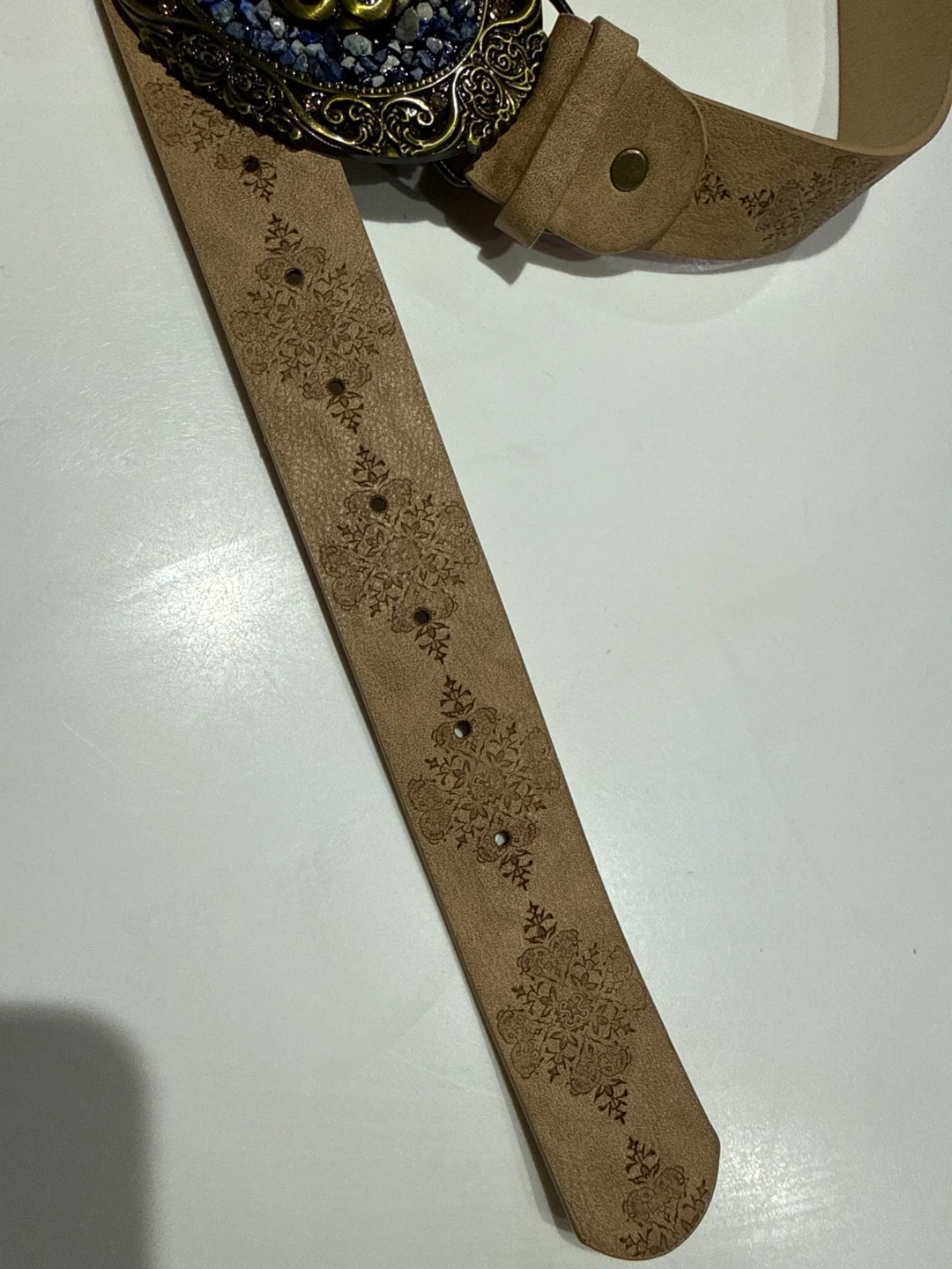 Tan leather belt with intricate embossed floral patterns. Features a large, oval-shaped ornate metal buckle embellished with blue stones and a central floral design. Great for adding a decorative touch to an outfit!