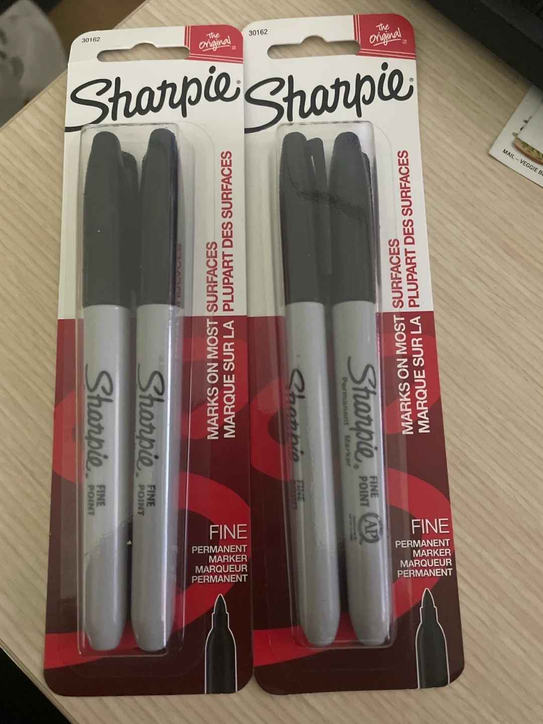 These are two packs of Sharpie fine point permanent markers. They're designed to mark on most surfaces. Each pack includes two black markers.