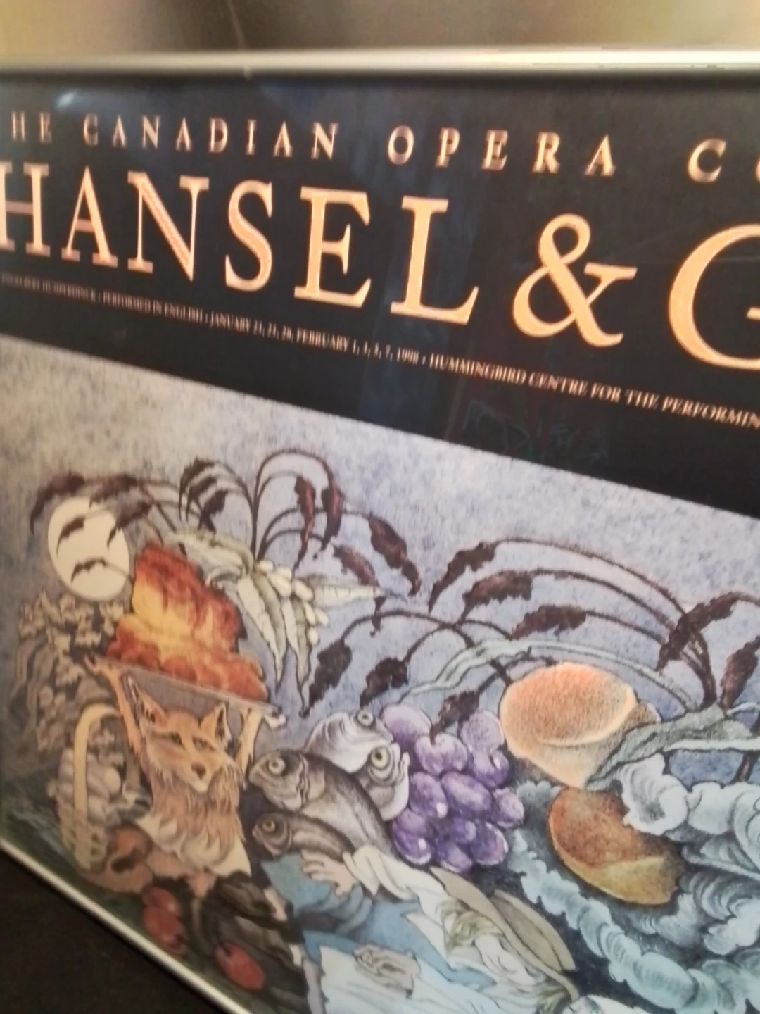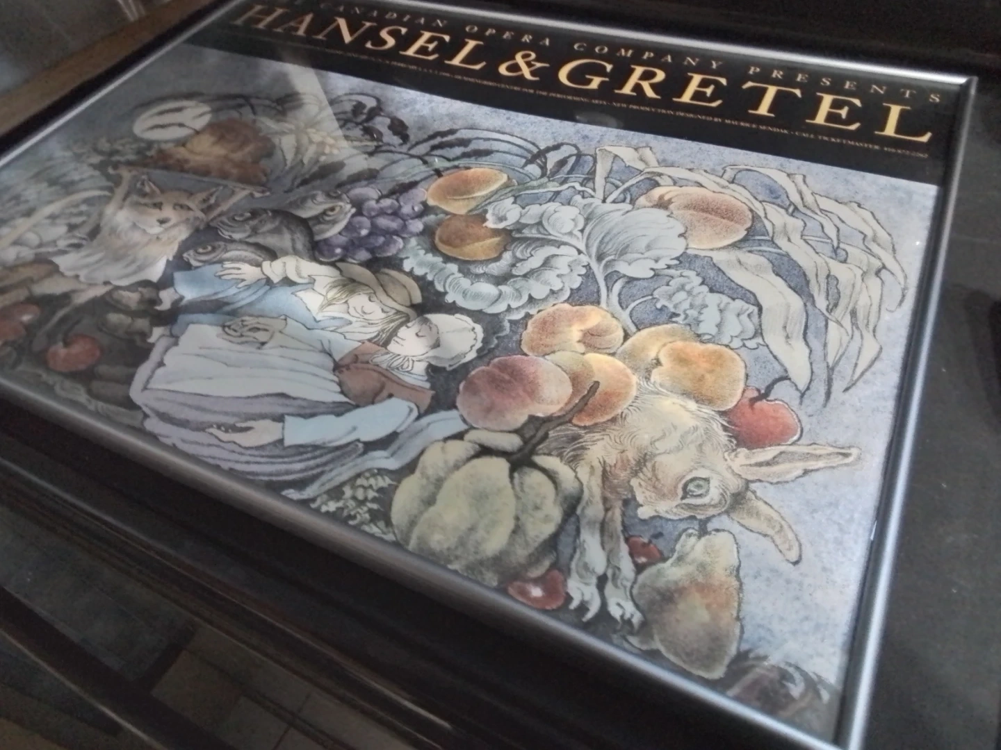Spruce up your space with this framed Canadian Opera Company poster featuring "Hansel & Gretel", sized at 24x18 inches. The poster showcases whimsical imagery from the opera. This is a used item, has been previously owned. It has some minor wear, but it's still charming and ready to adorn your wall! Perfect for opera aficionados or lovers of unique art pieces. I believe it would make a great addition to any collection!