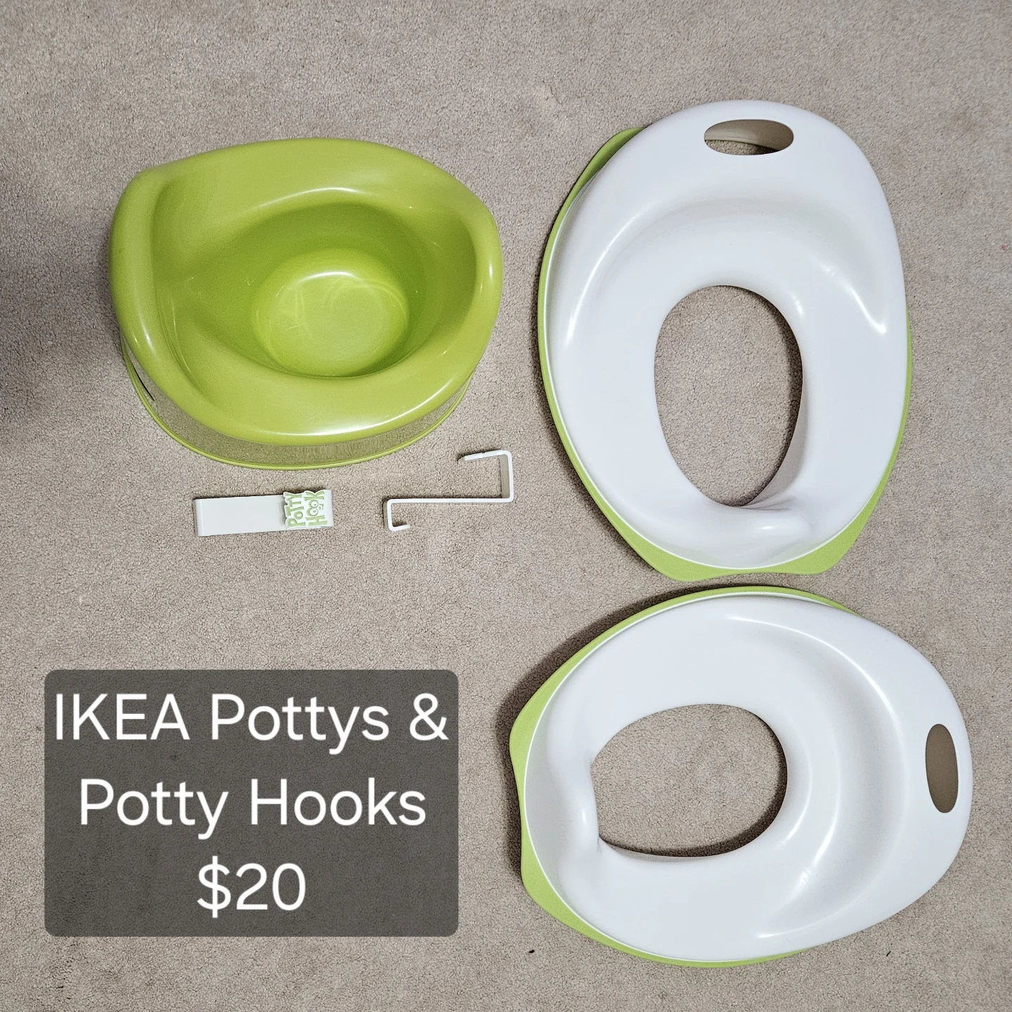This is a set of IKEA potty training items. It includes a green potty and two white potty training seats. Potty hooks are also included for convenience. This set is great for helping little ones learn to use the toilet.