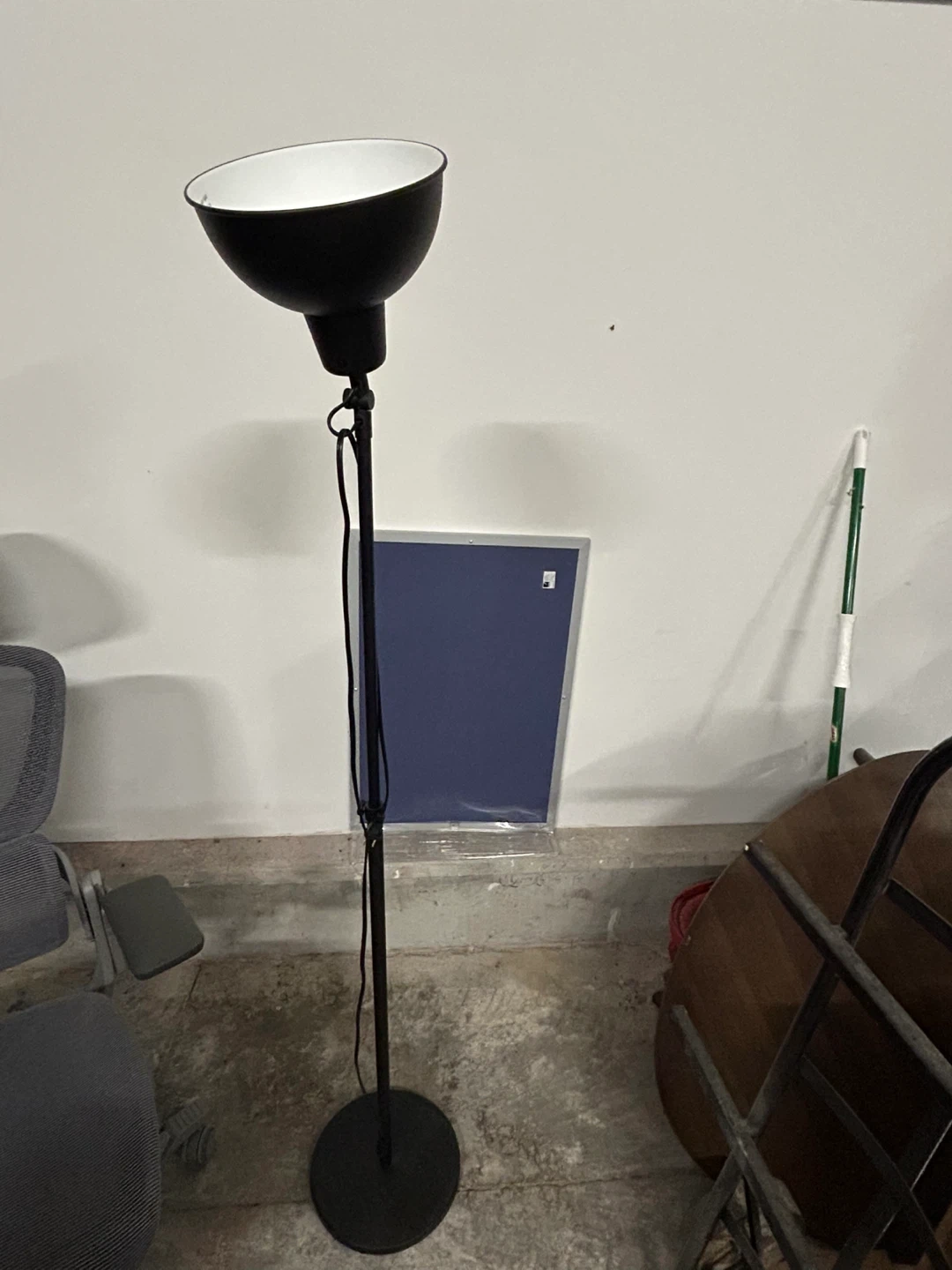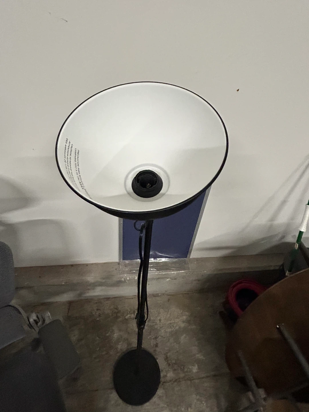 A simple black floor lamp with a white interior shade. It's adjustable and provides good lighting. Perfect for reading corners or adding ambient light to a room.