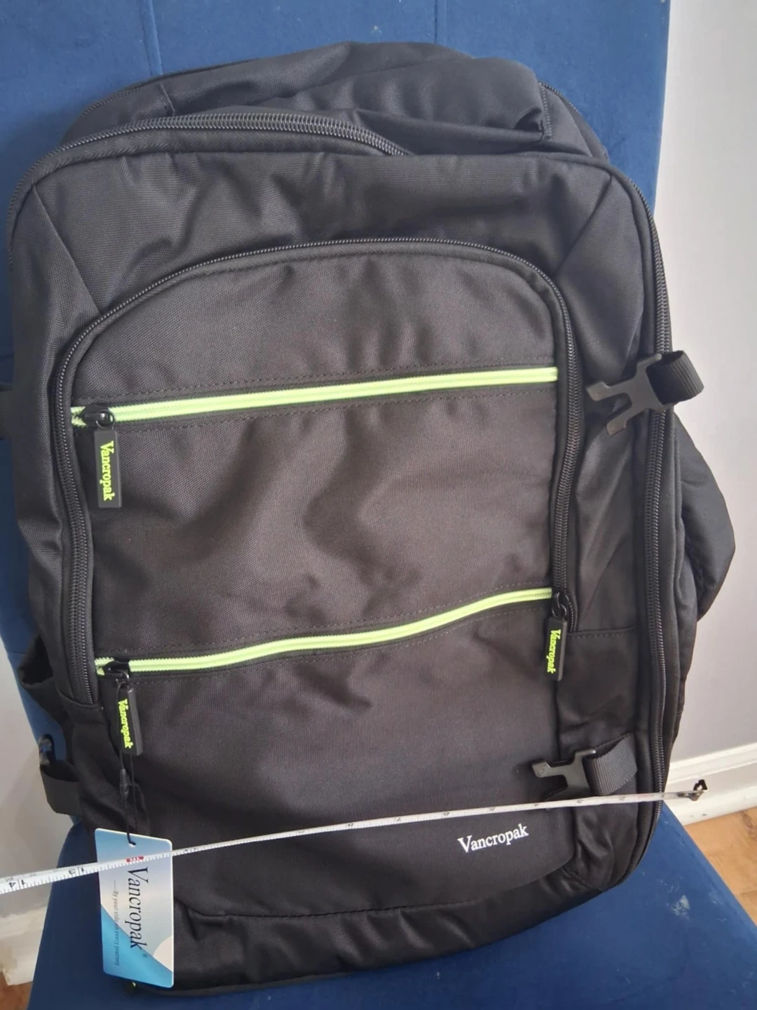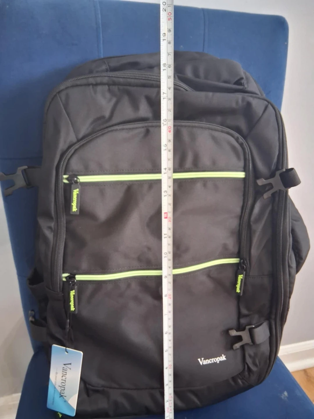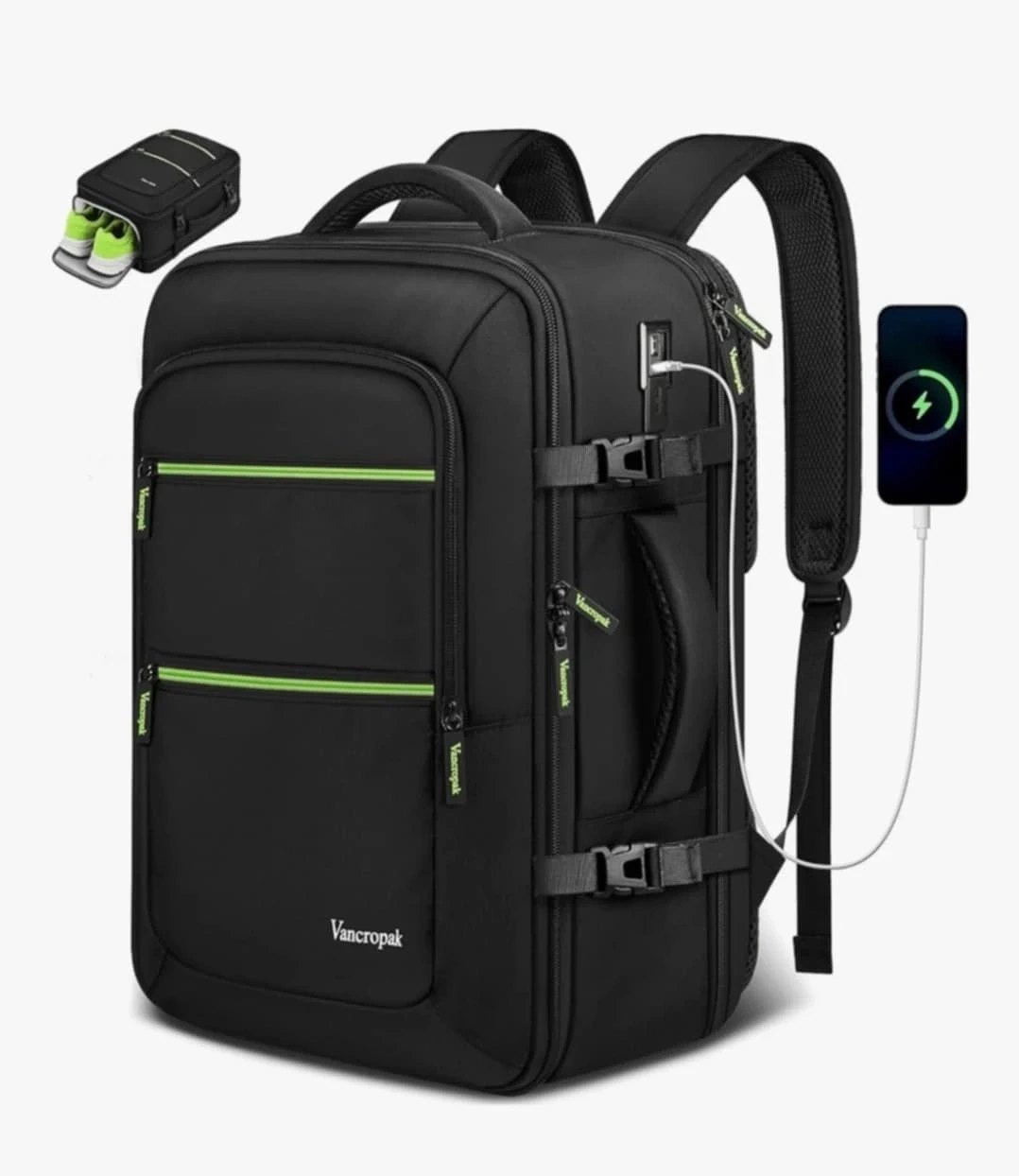 This black Vancropak backpack features a removable shoe compartment for separate storage and extra space. It has a built-in USB charging port. Dimensions are approximately 20 inches tall.