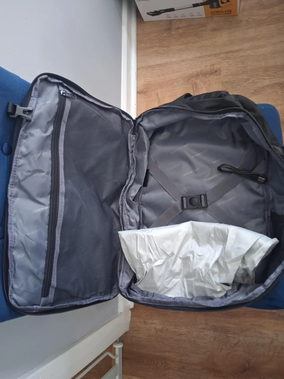 This black Vancropak backpack features a removable shoe compartment for separate storage and extra space. It has a built-in USB charging port. Dimensions are approximately 20 inches tall.