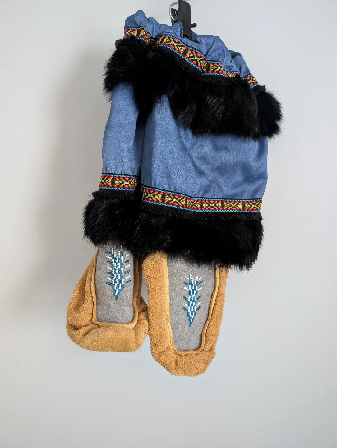 Cozy, warm, and one-of-a-kind! These handmade moccasins are crafted with suede, wool, and fur trim, finished with colorful ribbon and beaded designs. Perfect for keeping your feet toasty in the cold months while looking amazing.