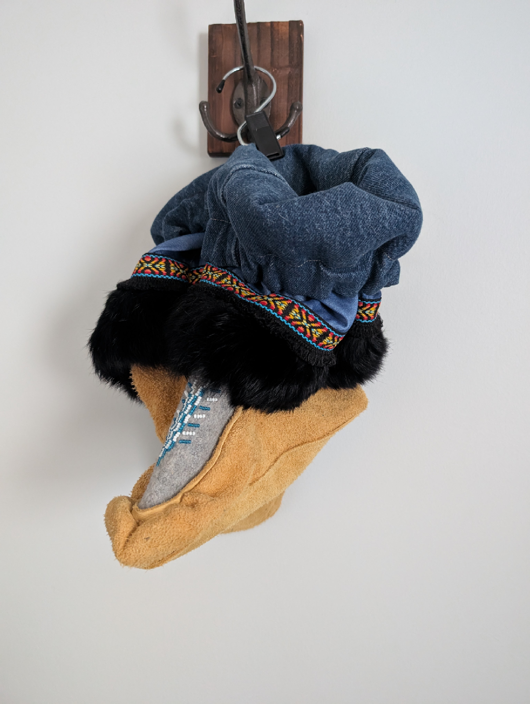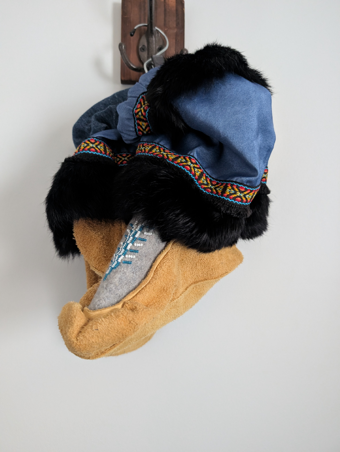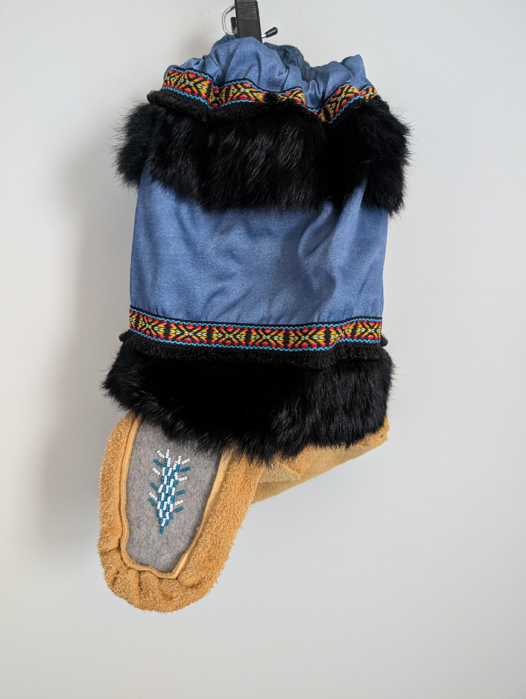 Cozy, warm, and one-of-a-kind! These handmade moccasins are crafted with suede, wool, and fur trim, finished with colorful ribbon and beaded designs. Perfect for keeping your feet toasty in the cold months while looking amazing.