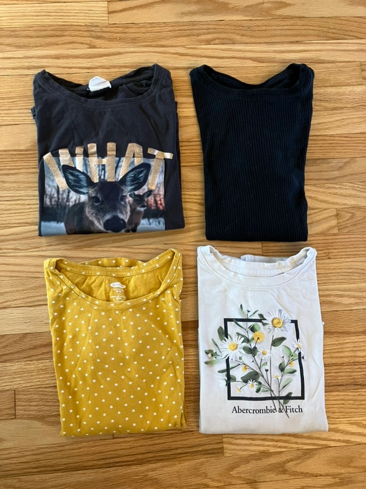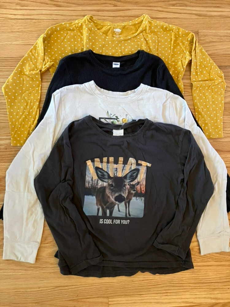 Bundle of 4 long sleeve shirts, 2 graphic shirts and 2 solid colours.