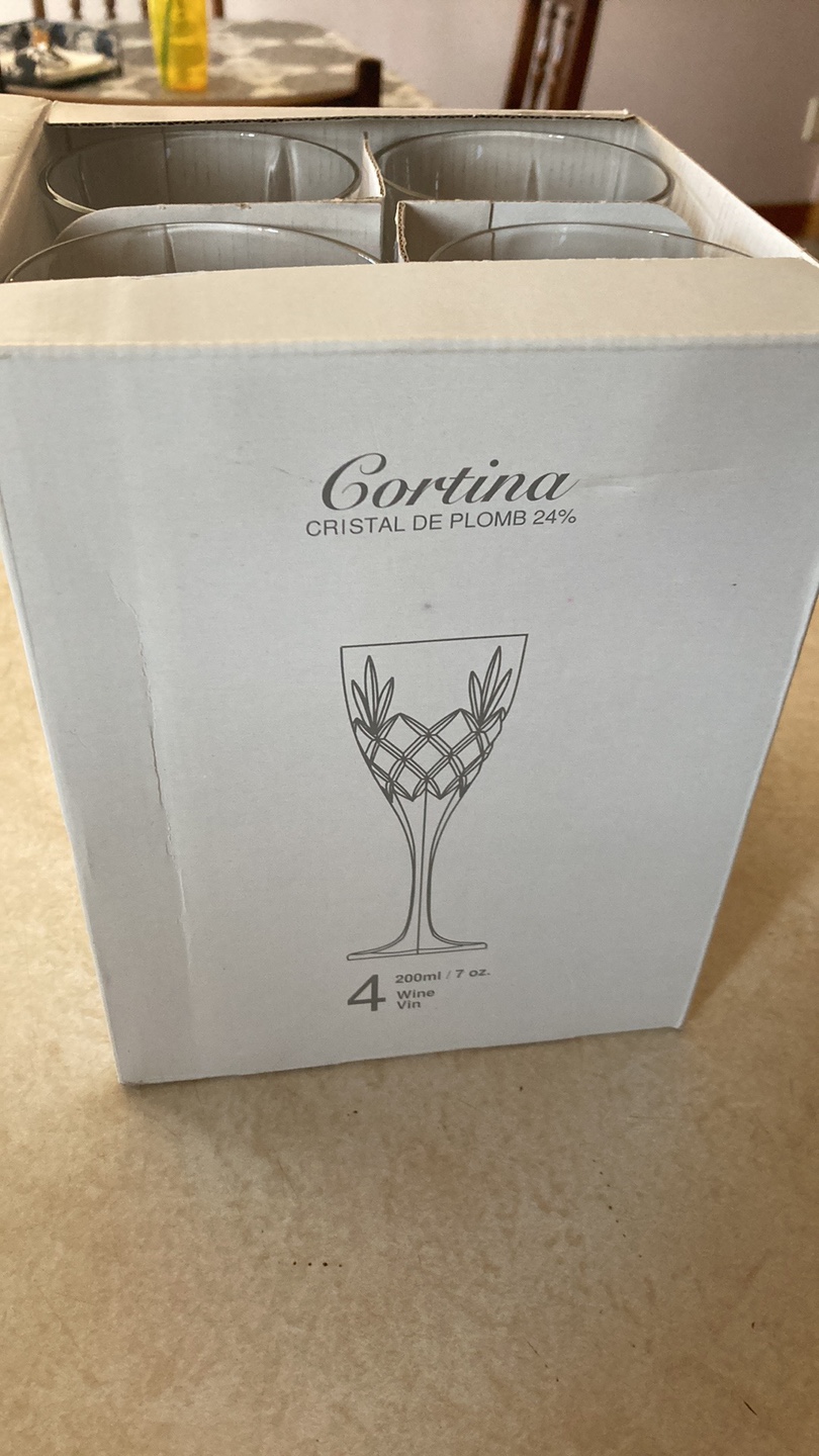 Set includes 7 wine glasses and one decanter. 24% lead crystal. Elegant cut glass design. New in box. Bowring 1811.
