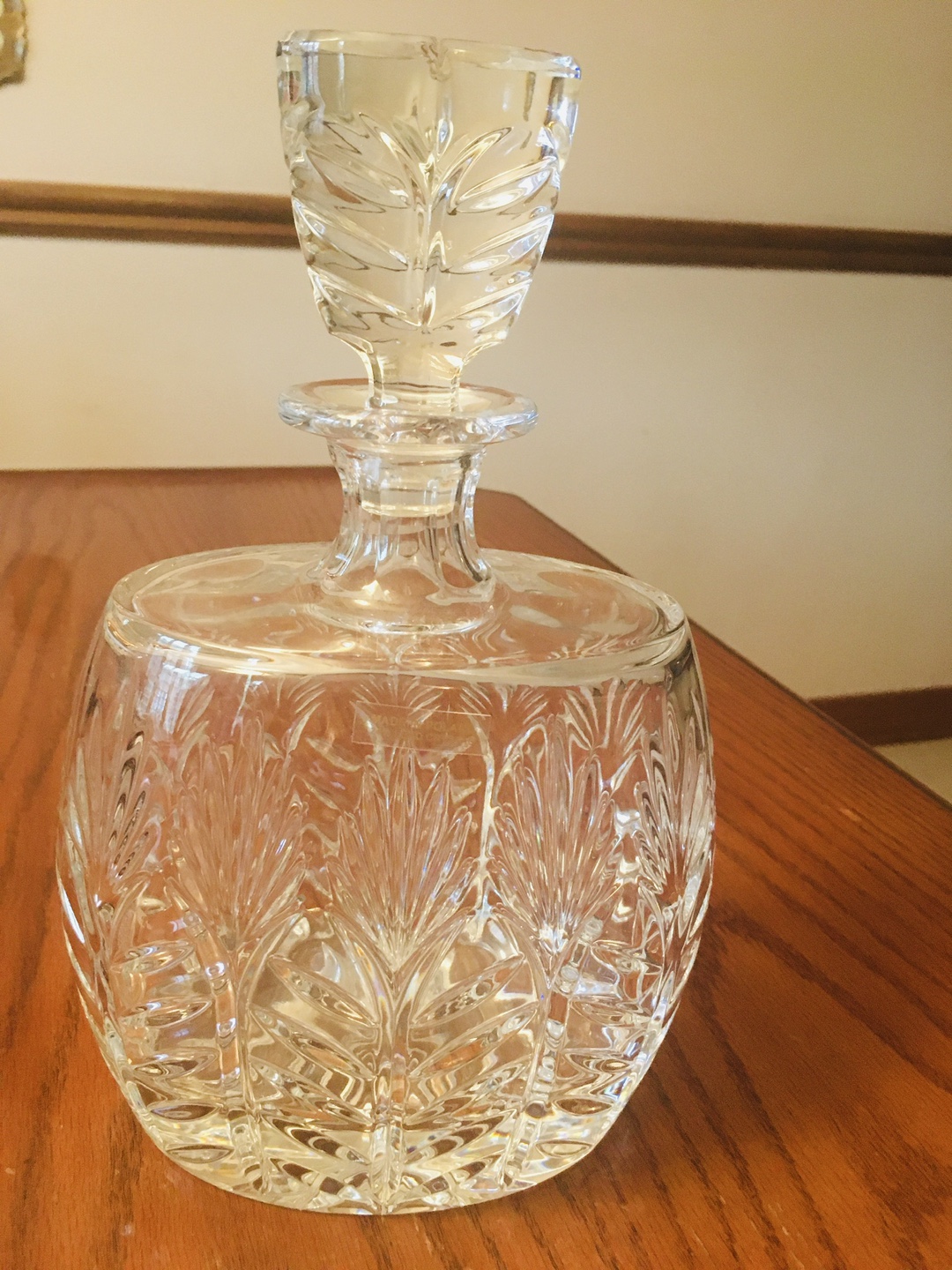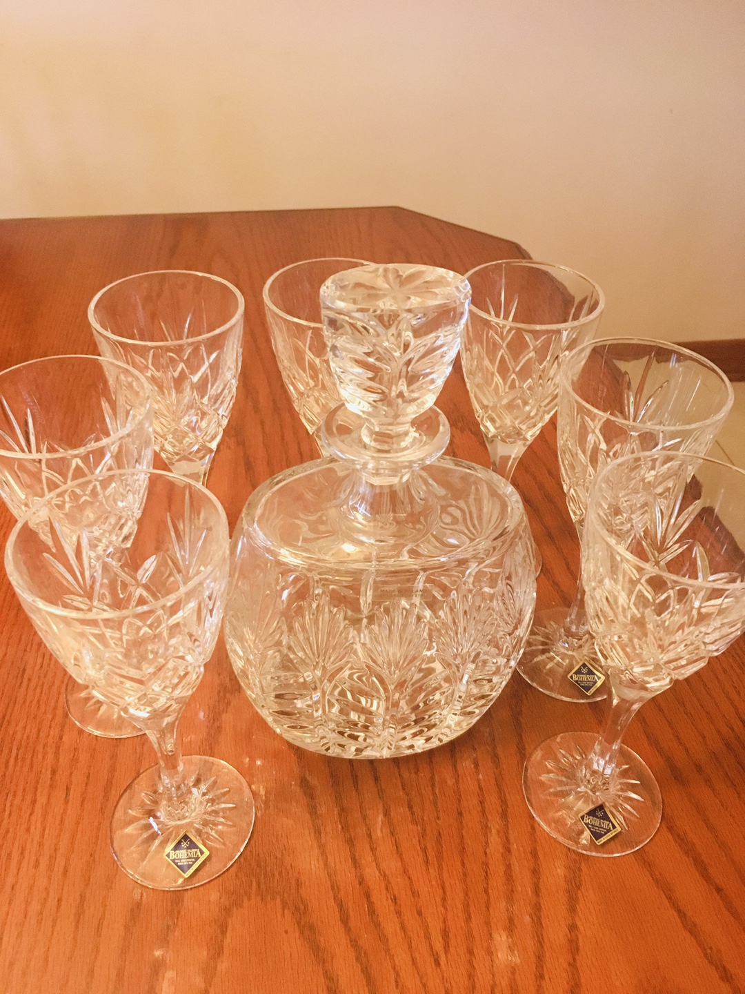 Selling a beautiful Bohemia crystal decanter set. It includes a decanter with a stopper and six matching glasses. The crystal is clear and has an intricate cut pattern. Perfect for serving wine or spirits in style!