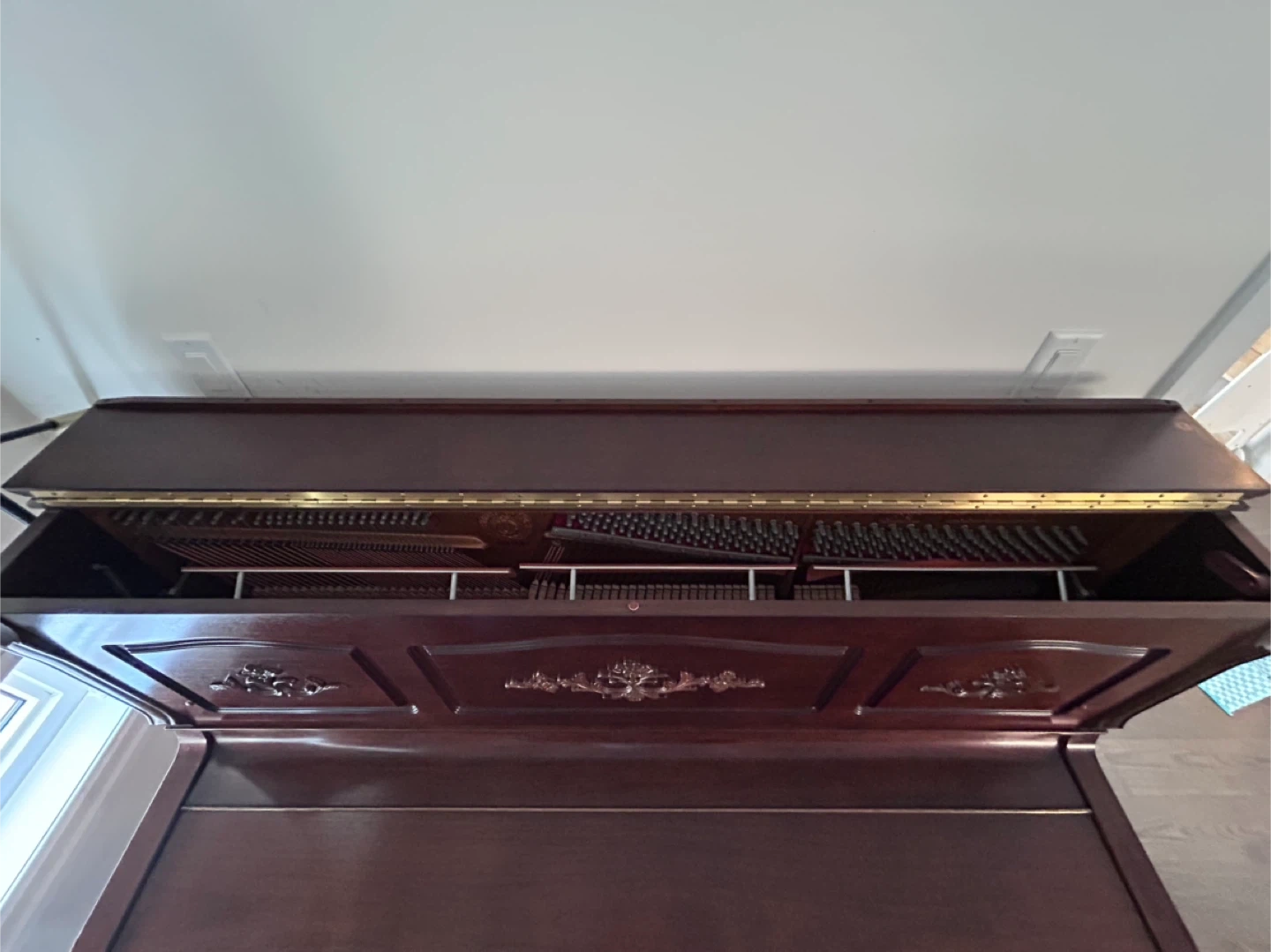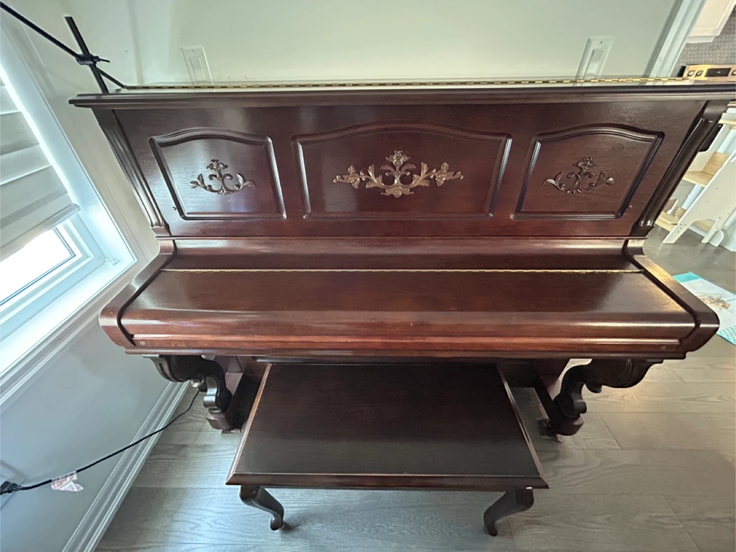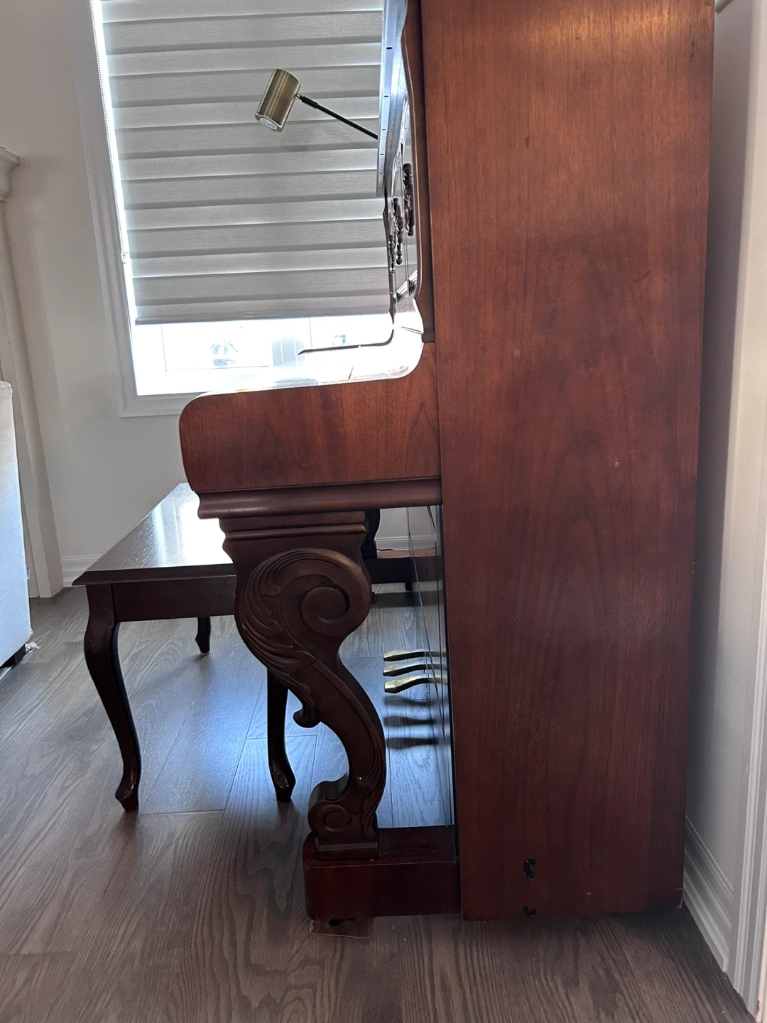 Beautiful dark wood upright piano (Young Chang U121) Includes matching bench. This piano is a lovely addition to any place for musical enjoyment. Giving away because of moving.