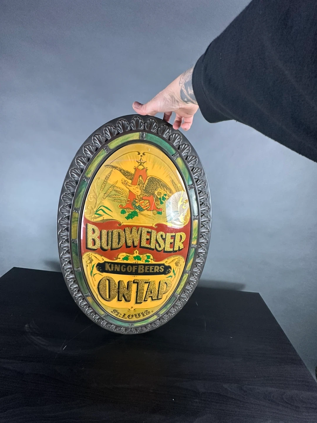 This oval sign features the classic Budweiser 'King of Beers' logo with 'On Tap' text below. It has a decorative, dark-coloured frame surrounding the colourful graphic. The back appears to be made of pressed wood. Perfect for a bar or rec room!