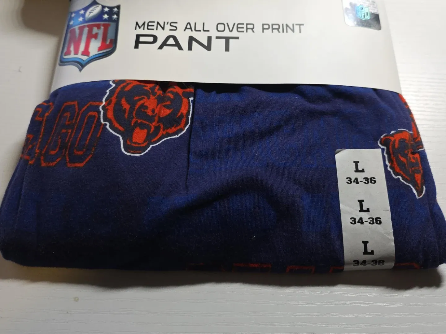 These are NFL men's all-over print pants featuring the Chicago Bears logo. They are a size Large (34-36). Perfect for any Bears fan!