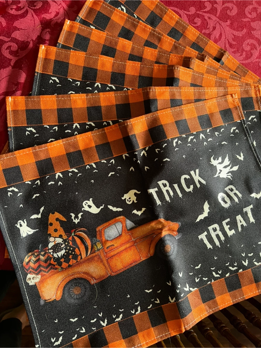 These festive placemats are perfect for adding a touch of Halloween fun to your dining table! They feature a cute design with an orange truck, pumpkins, ghosts, and bats, along with the words "Trick or Treat". The placemats have a black background with an orange and black checkered border. They're in great condition and ready to bring some spooky cheer to your home