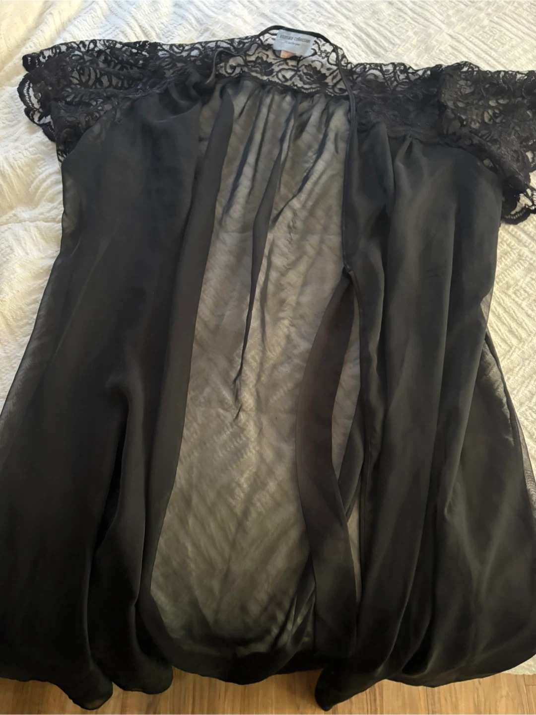 Two-piece lingerie set featuring a black satin nightgown with lace trim. Also includes a sheer black lace-trimmed robe. Both pieces are designed for comfort and elegance. it’s almost floor length!